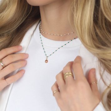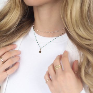 gigiCLOZEAU is a mother-daughter, family-inspired brand. In the south of France, Gigi Clozeau was born into a life of rich color and design, foreshadowing her future career as a jeweler. Like Gigi, her father, Alain, was a skilled jeweler of 50 years. In preparation for Gigi’s birth, Alain hand-crafted a bracelet made from a delicate gold chain, adorned by colorful resin pearls, thus setting the tone for Gigi’s brand. In her family’s workshop, Gigi uses 18-carat gold, diamonds, and high-quality varnish to create her dainty chains of resin beads in a striking range of colors.