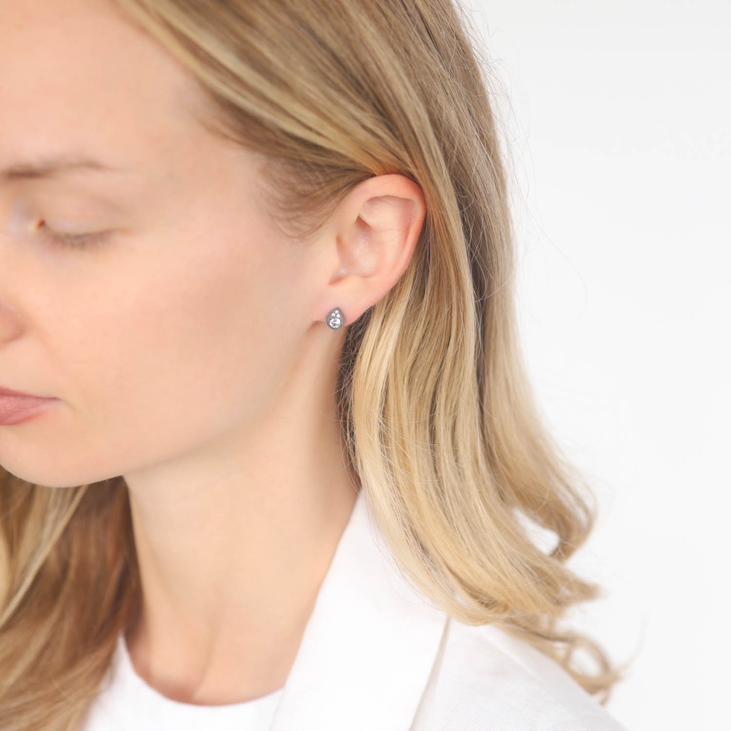 Clean silhouettes, luxurious textures, and architectural constructions embody .925Suneera’s jewelry. The Minn Studs feature a single sparkling sapphire, elevated by a trio of petite diamonds, against a shimmering surface, textured by granulation.