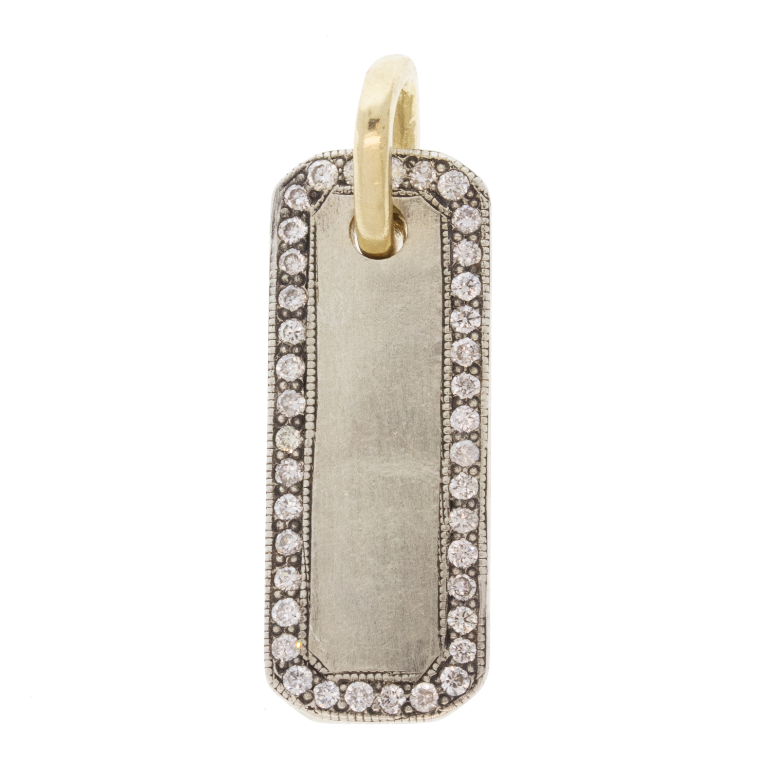 Sweet and sparkly with a cool edge, teeny twinkling diamonds outline this two-tone dog tag pendant. Wear it on a chain as a stand alone piece or as a base to your charm collection.