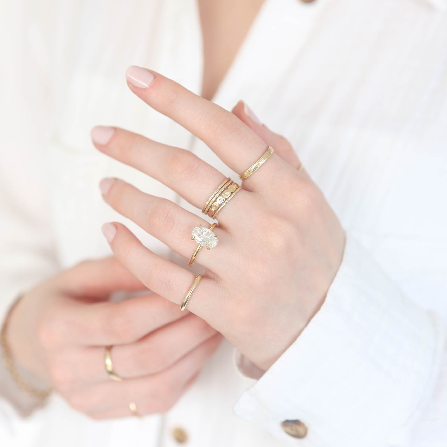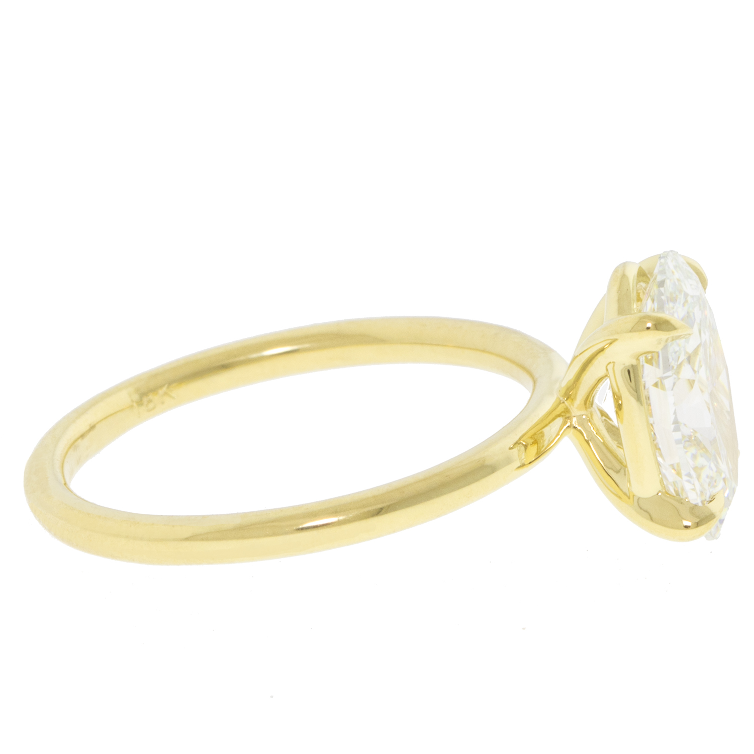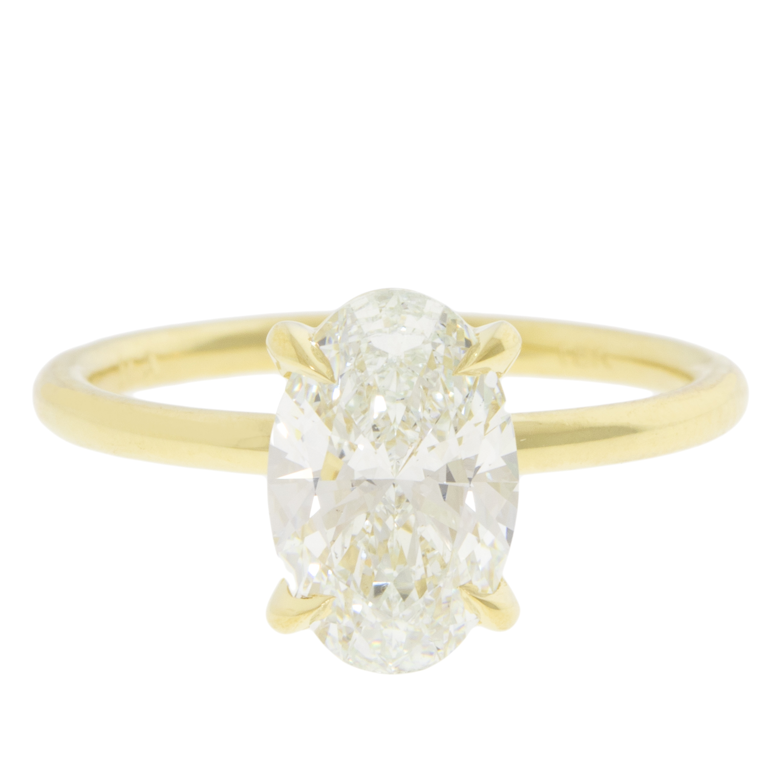 A stunning oval solitaire diamond is paired with a smooth yellow gold band that sparkles and shines endlessly.