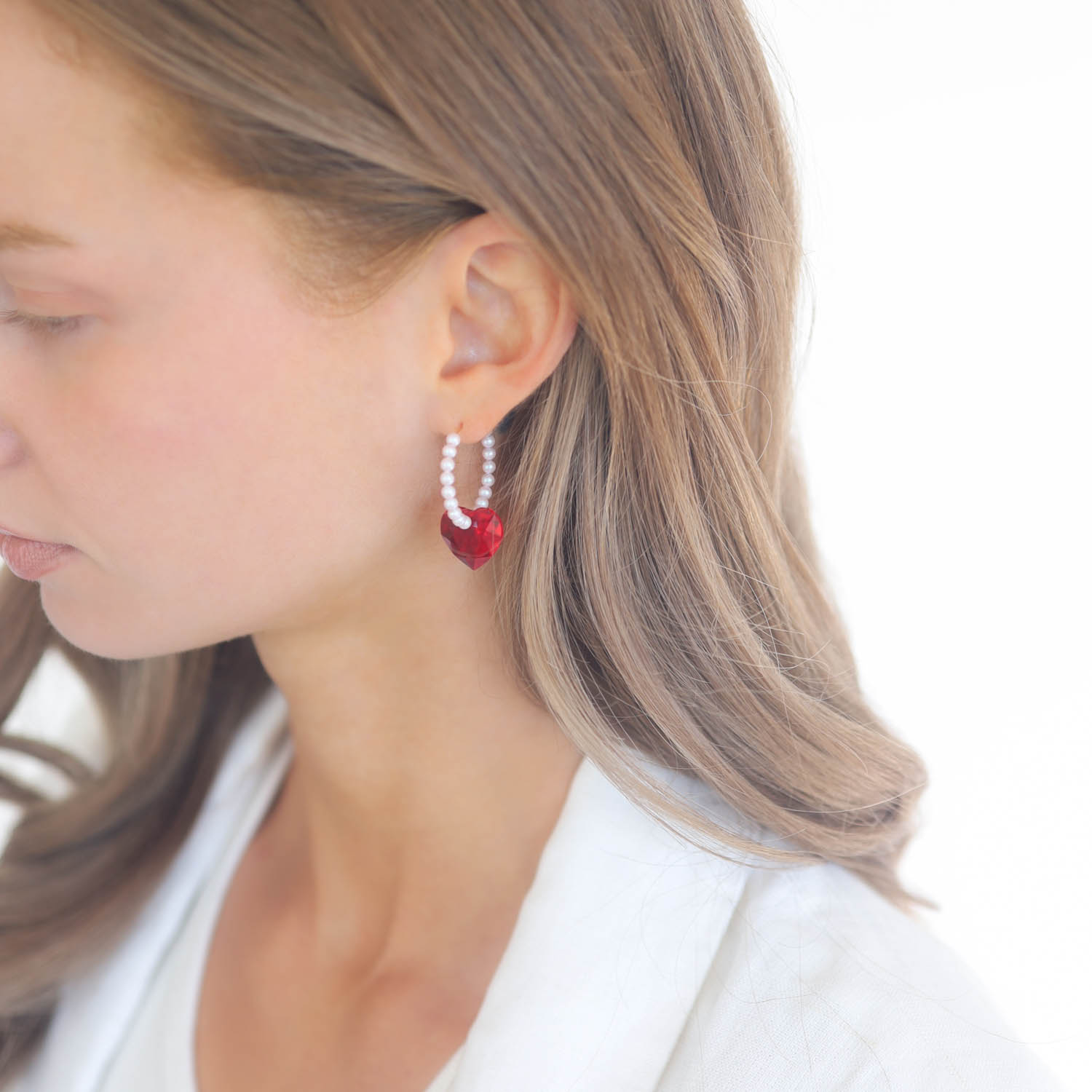 These earrings are complete with round, lustrous beads and a candy-red crystal accent that create a harmonic balance between chic and playful.