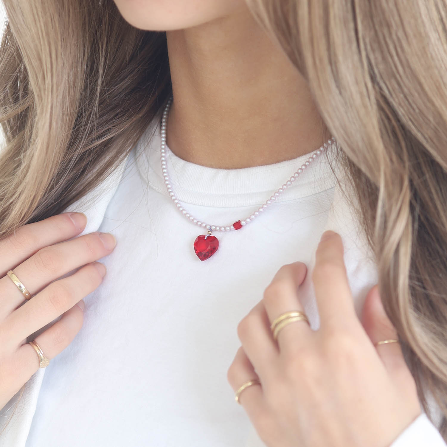 This necklace is complete with round, lustrous beads and candy-red crystal accents that create a harmonic balance between chic and playful.