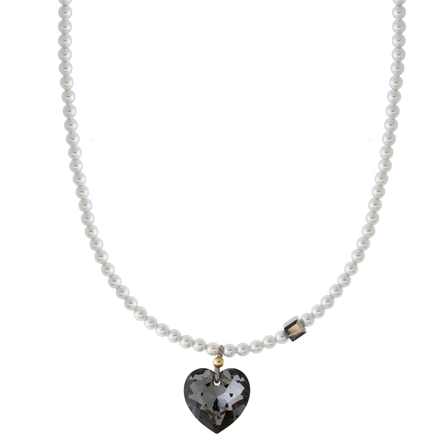 This necklace is complete with round, lustrous beads and a heart-shaped crystal accent that create a harmonic balance between chic and playful.