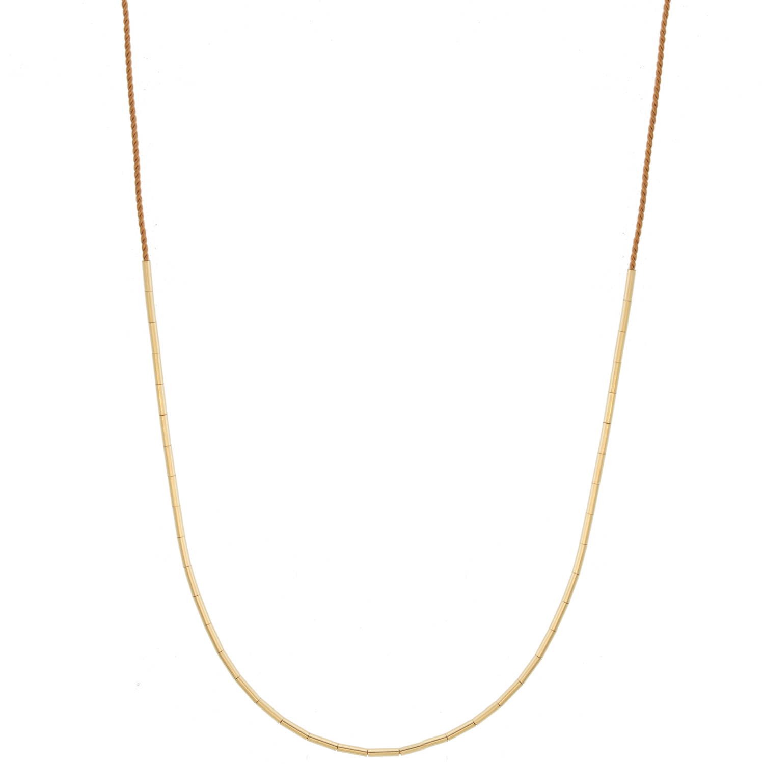 The epitome of simple and sweet. Gold tube beads float freely on a silk cord, easily formed into a gold arc or redistributed into a smattering of gold as you please. A minimalistic piece that’s perfect for everyday wear.
