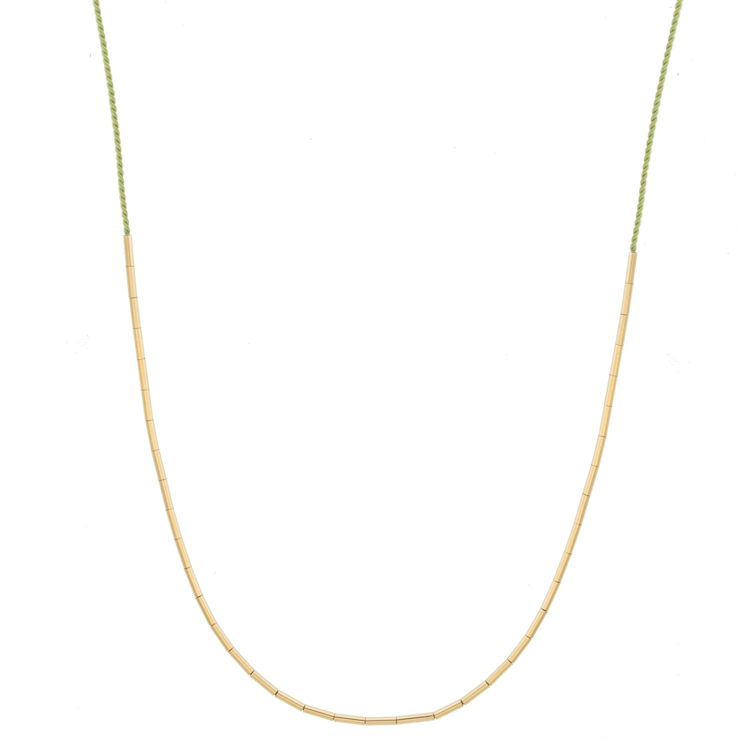 The epitome of simple and sweet. Gold tube beads float freely on a silk cord, easily formed into a gold arc or redistributed into a smattering of gold as you please. A minimalistic piece that’s perfect for everyday wear.