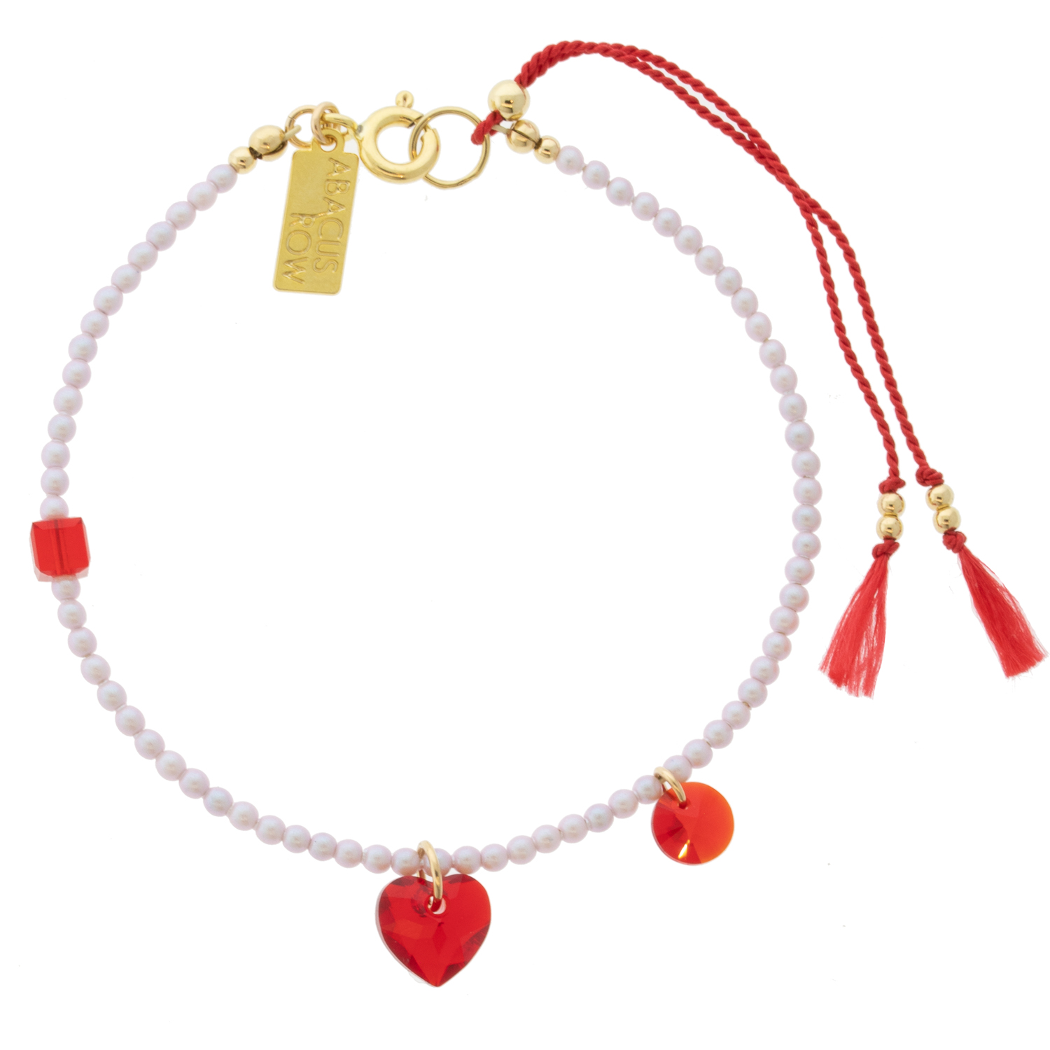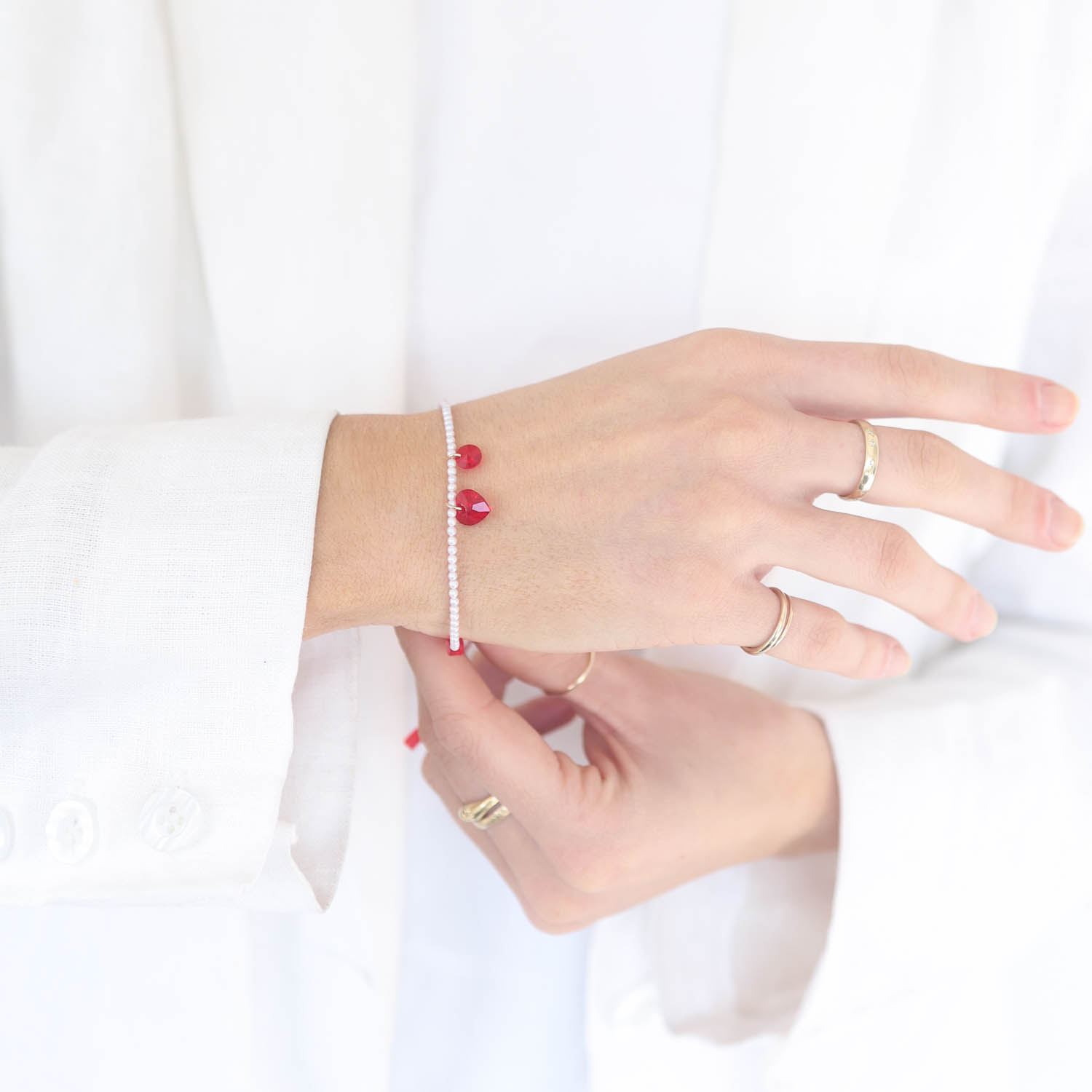 This bracelet is complete with round, lustrous beads and candy-red crystal accents that create a harmonic balance between chic and playful.