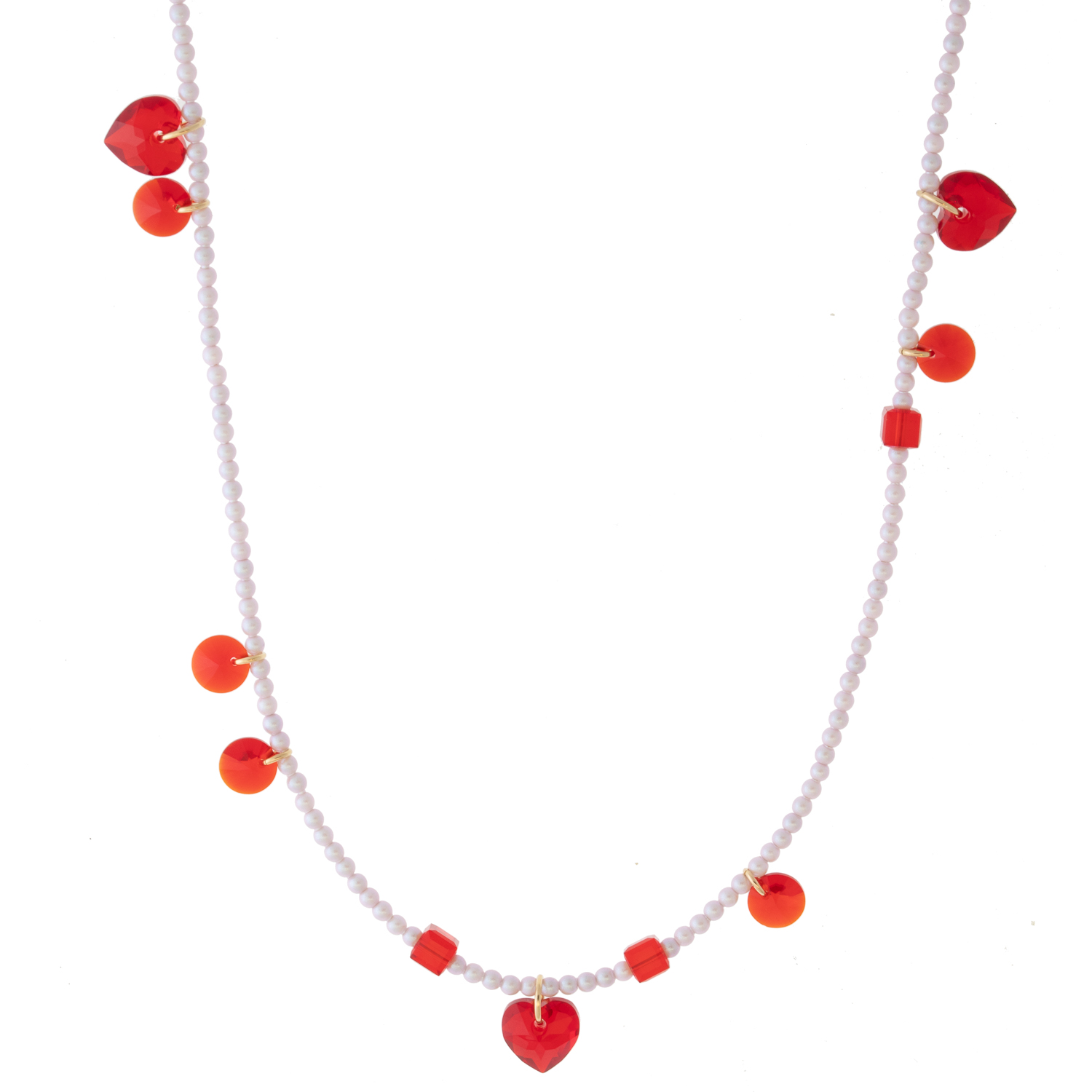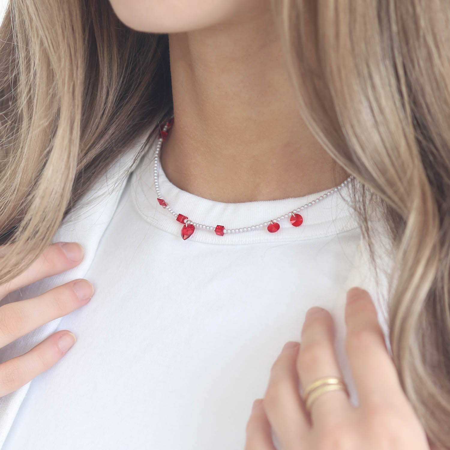 This necklace is complete with round, lustrous beads and candy-red crystal accents that create a harmonic balance between chic and playful.