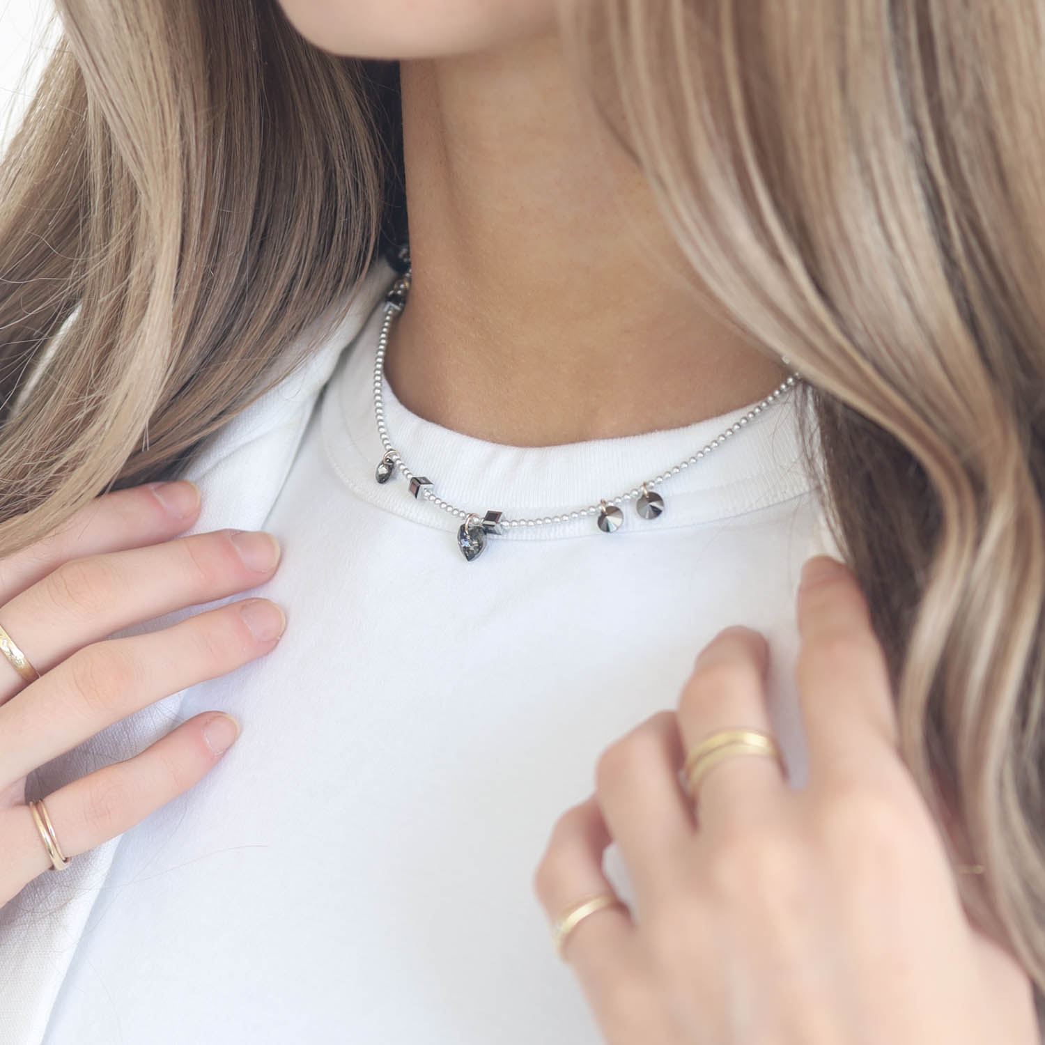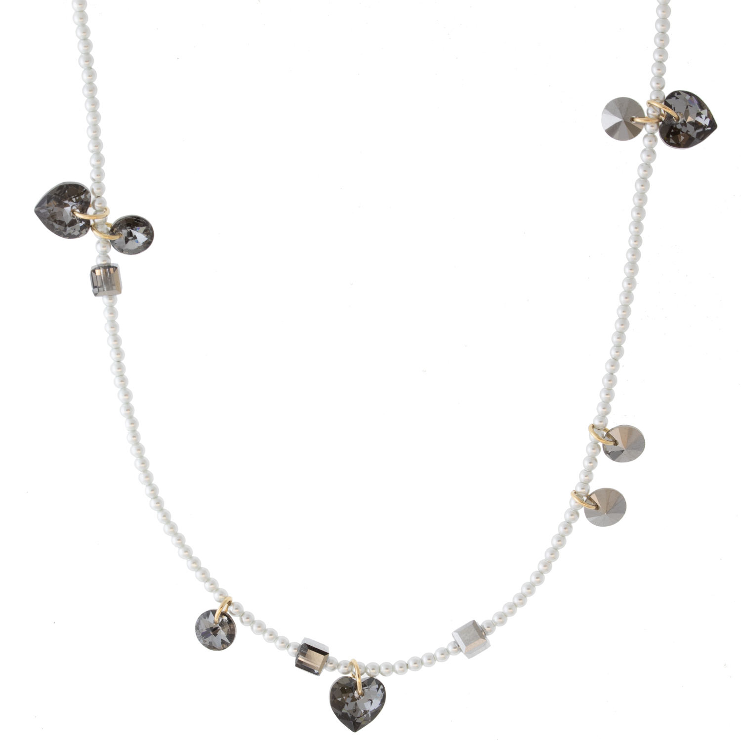 This necklace is complete with round, lustrous beads and crystal accents that create a harmonic balance between chic and playful.