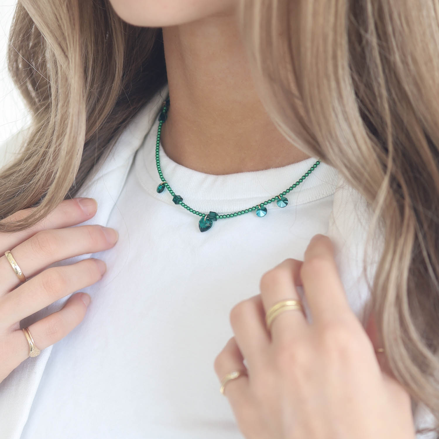 This necklace is complete with round, lustrous beads and crystal accents that create a harmonic balance between chic and playful.