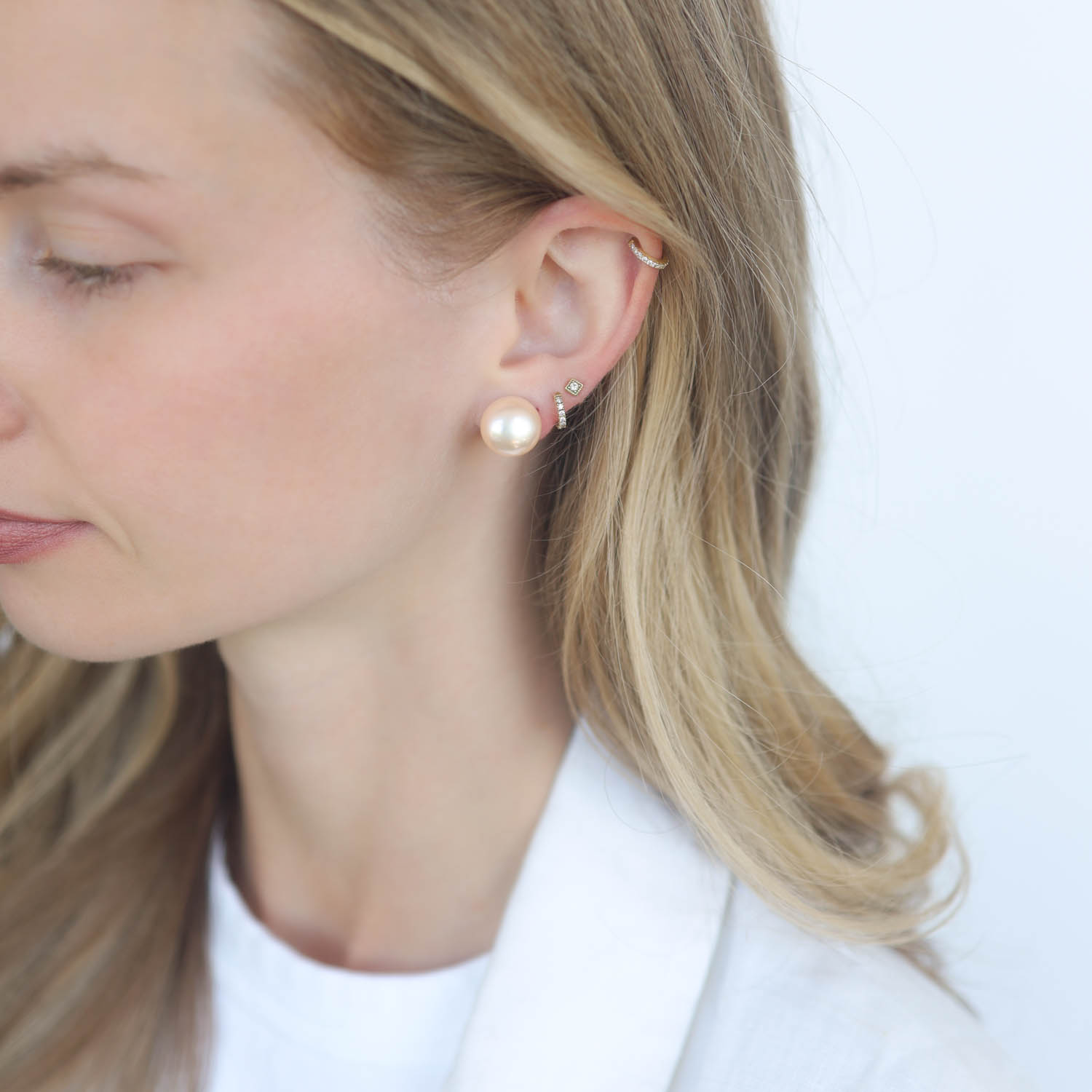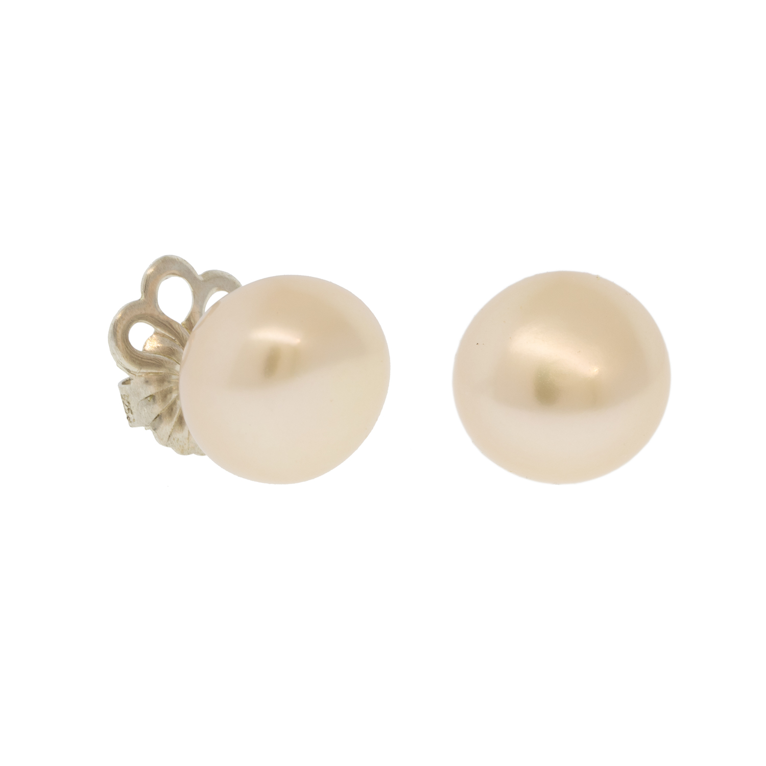 These stud earrings are exceptionally elegant, from the luminous surface of the peach toned pearls to the ornate detailing of the silver backings.