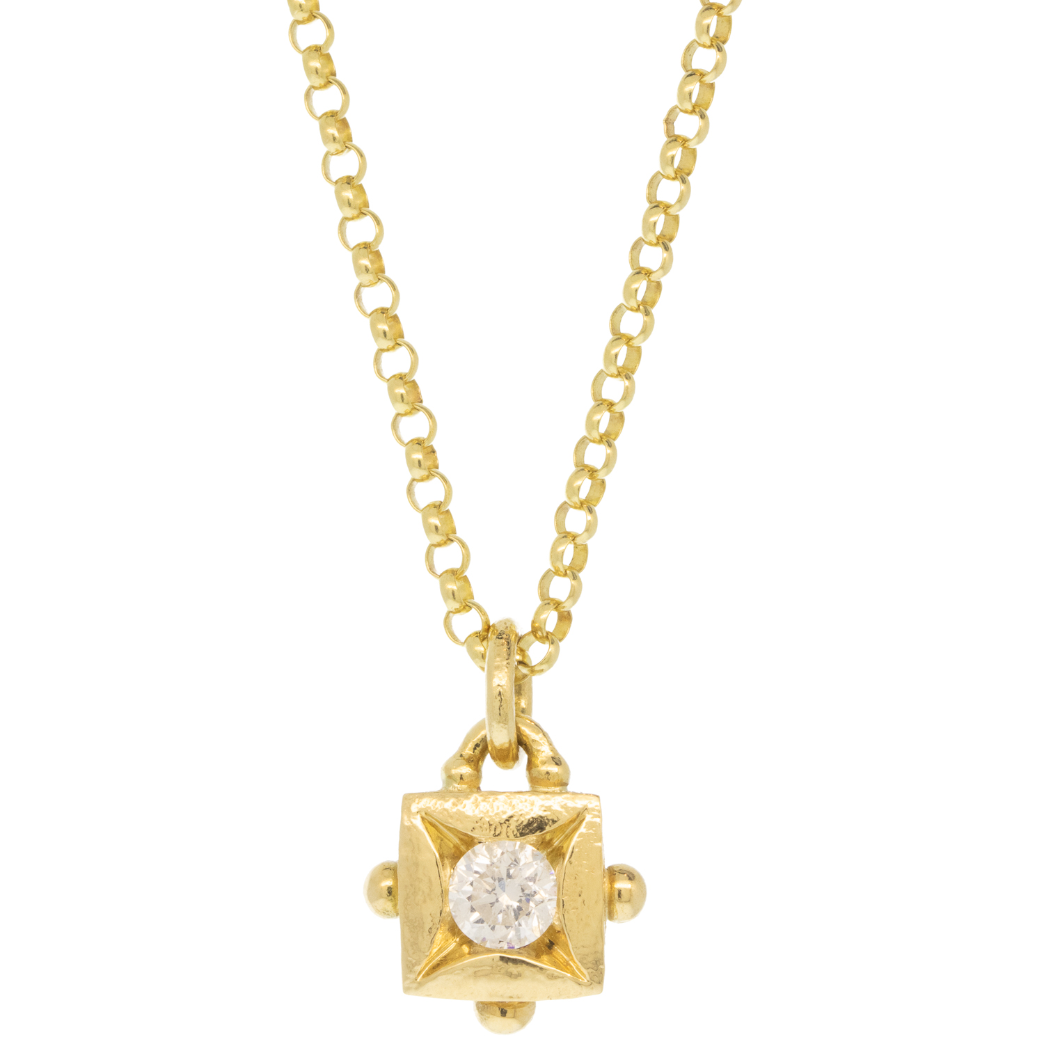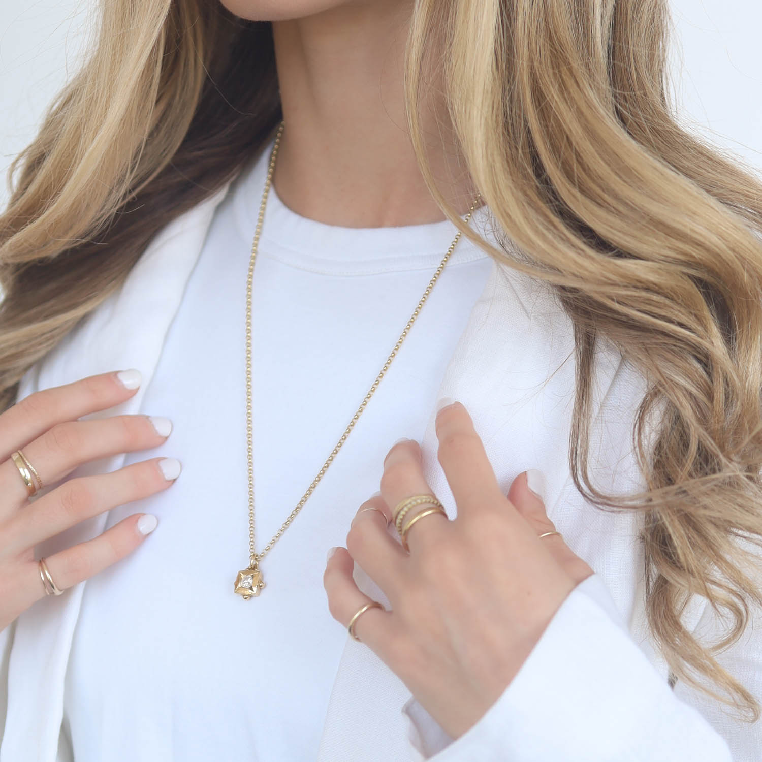This sparkling white diamond is accentuated by its rustic setting on a lithe gold chain