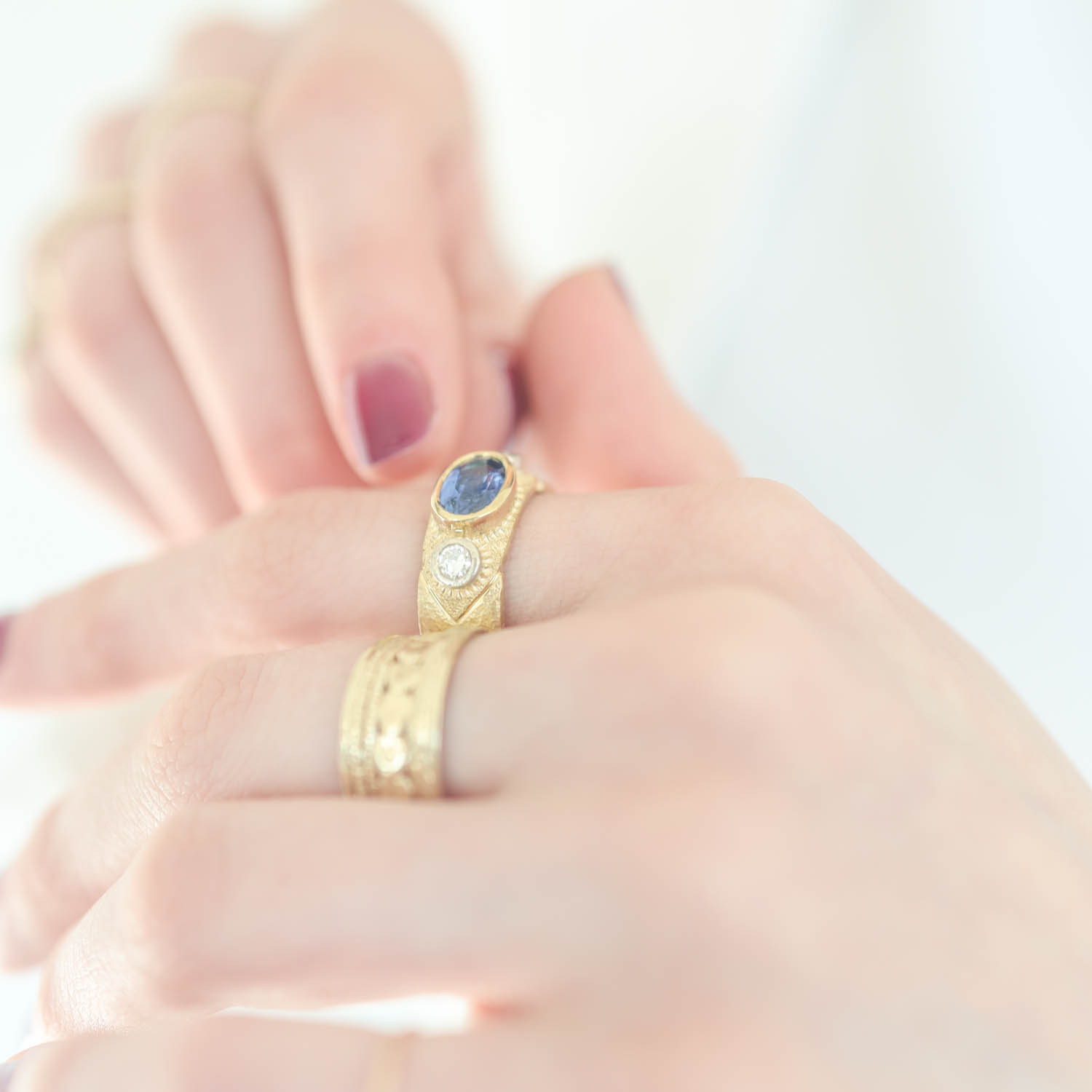 A ring bursting with elegance and timeless beauty. This sparkling blue sapphire is surrounded by decorative golden dots and diamonds, all set on a band of sterling silver.
