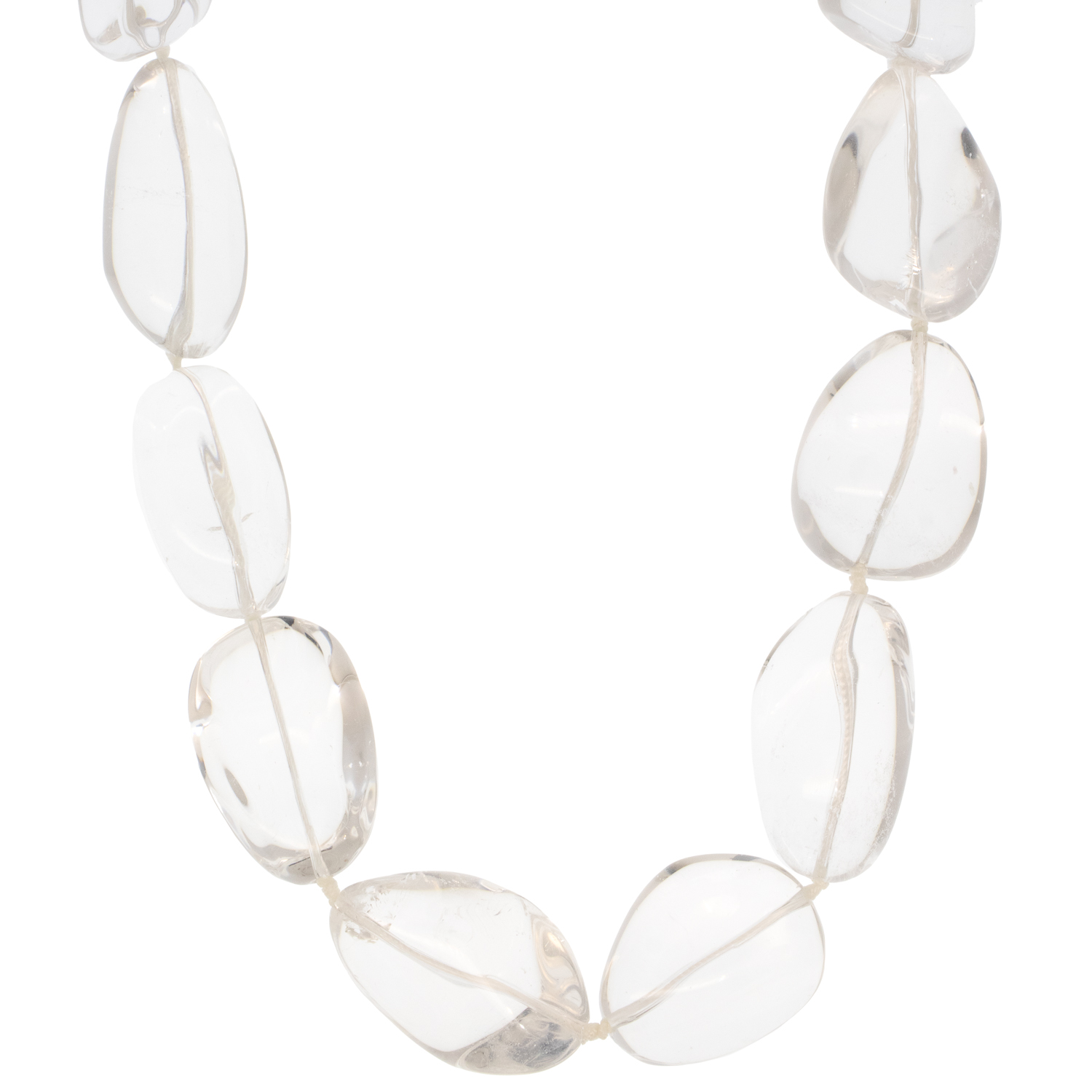 Prominent, tumbled rock crystal are strung together, creating a statement piece with the element of timeless elegance.
