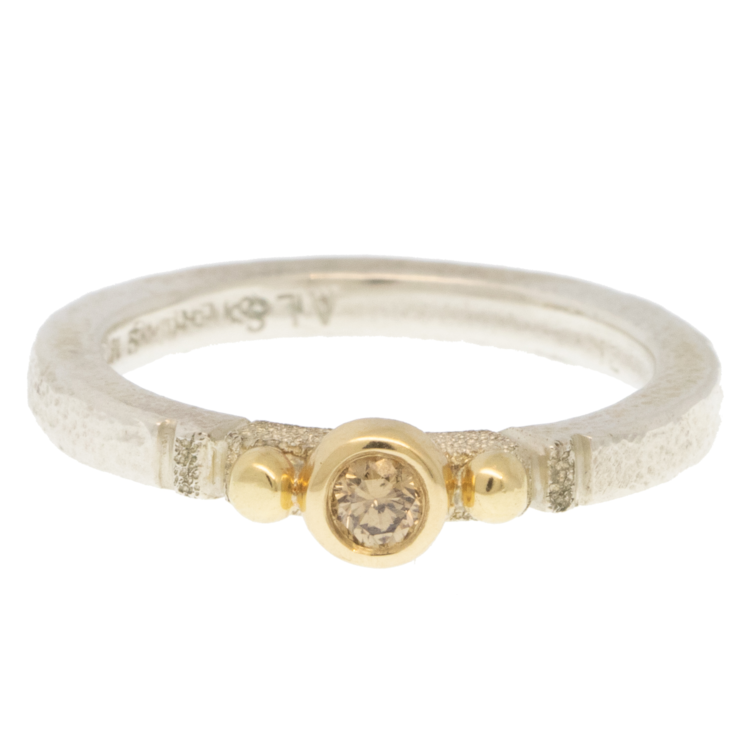 The most gorgeous diamond is set in contrasting gold bezel on a textured band of silver. With a striking presence, this ring feels as beautiful to wear as it looks.