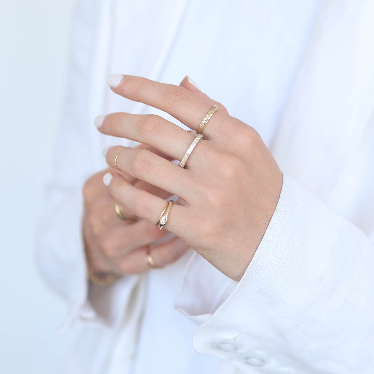 This textured, carved band is the ideal stacking ring in all its simple elegance.