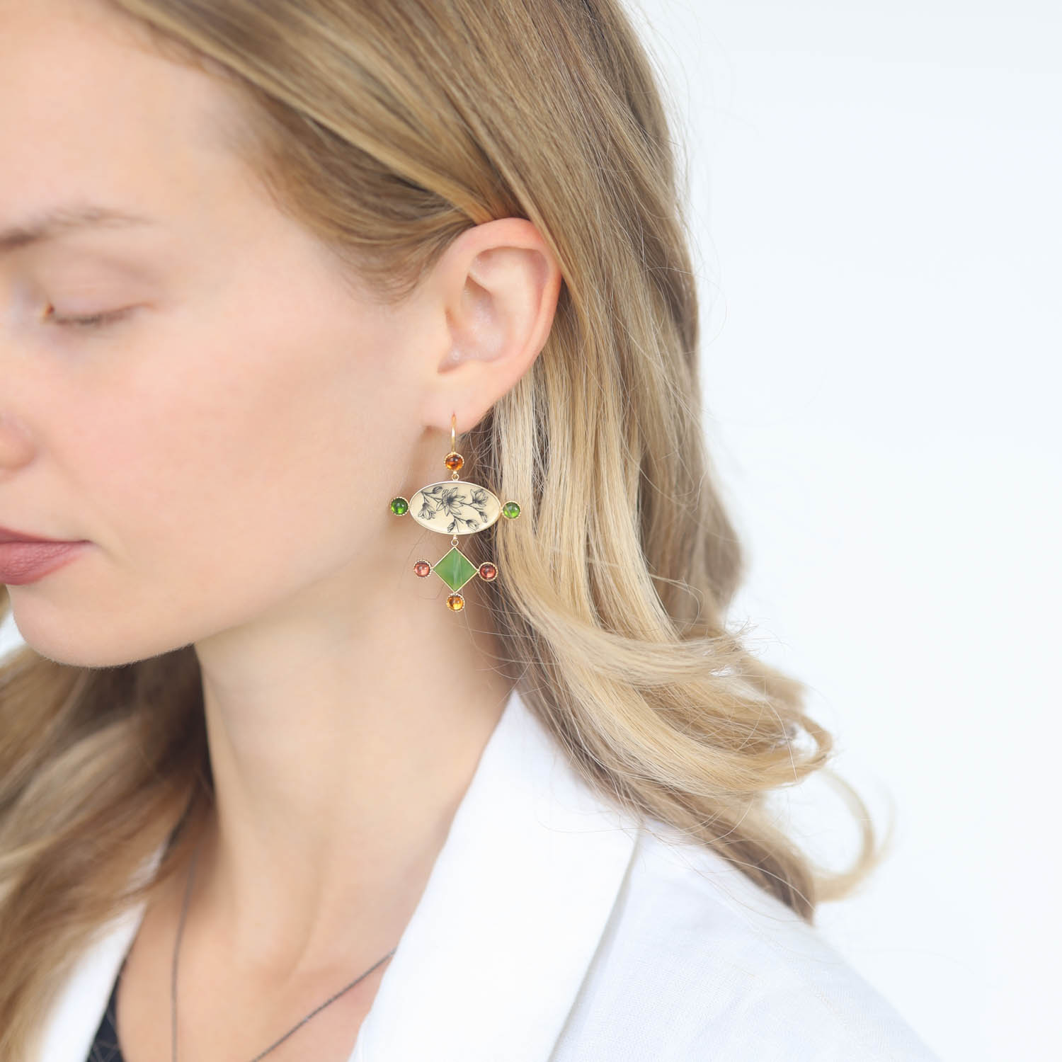 These stylish gold earrings feature intricate, realistic magnolia motifs on a large durable plastic face. The sleek form of the earwire and vibrant hue of the stones emphasize the design’s marriage of simplicity and elegance, complimenting the unique aspect of the hand-sketched artwork.