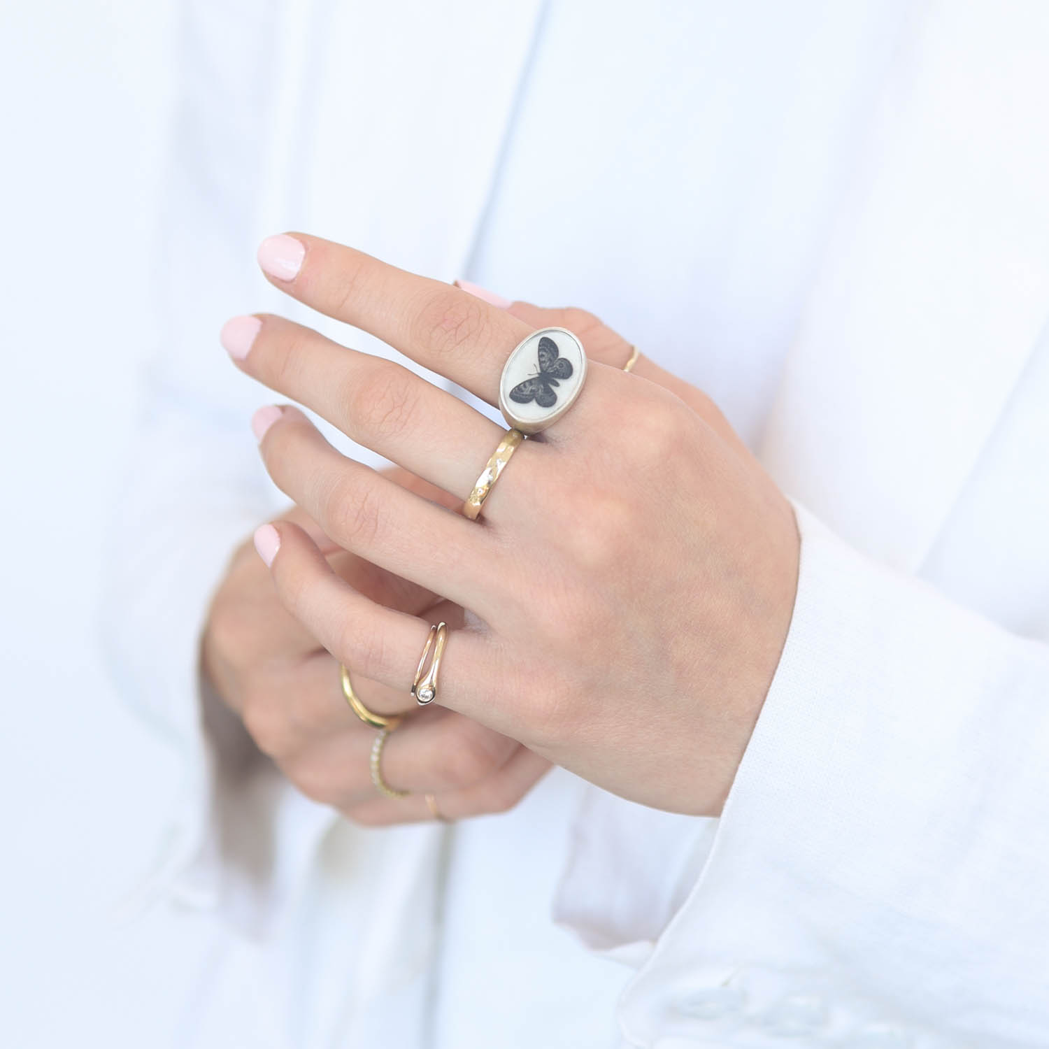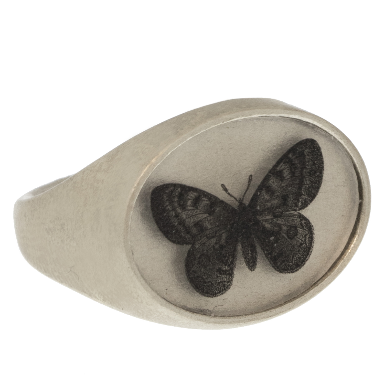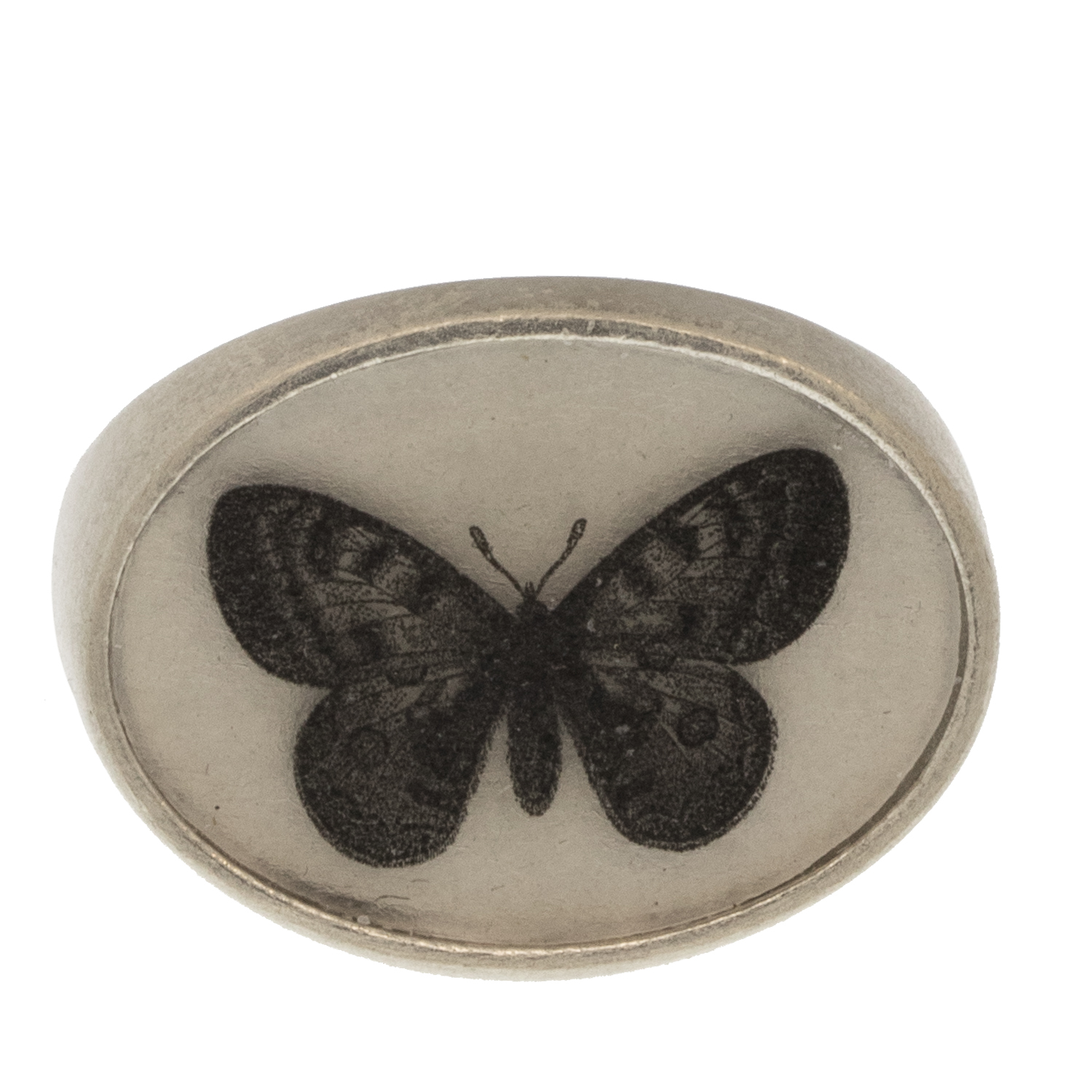 This charming silver band features a plastic surface showcasing a beautifully hand-sketched butterfly. The intricate design adds a whimsical touch to the bold silhouette of the band. Perfect for everyday wear, this ring makes a delightful statement piece. Butterflies have long been worn as symbols of transformation, change, and rebirth. The way that they change from a caterpillar to a beautiful winged creature is symbolically linked to personal growth and the ability to embrace new beginnings.