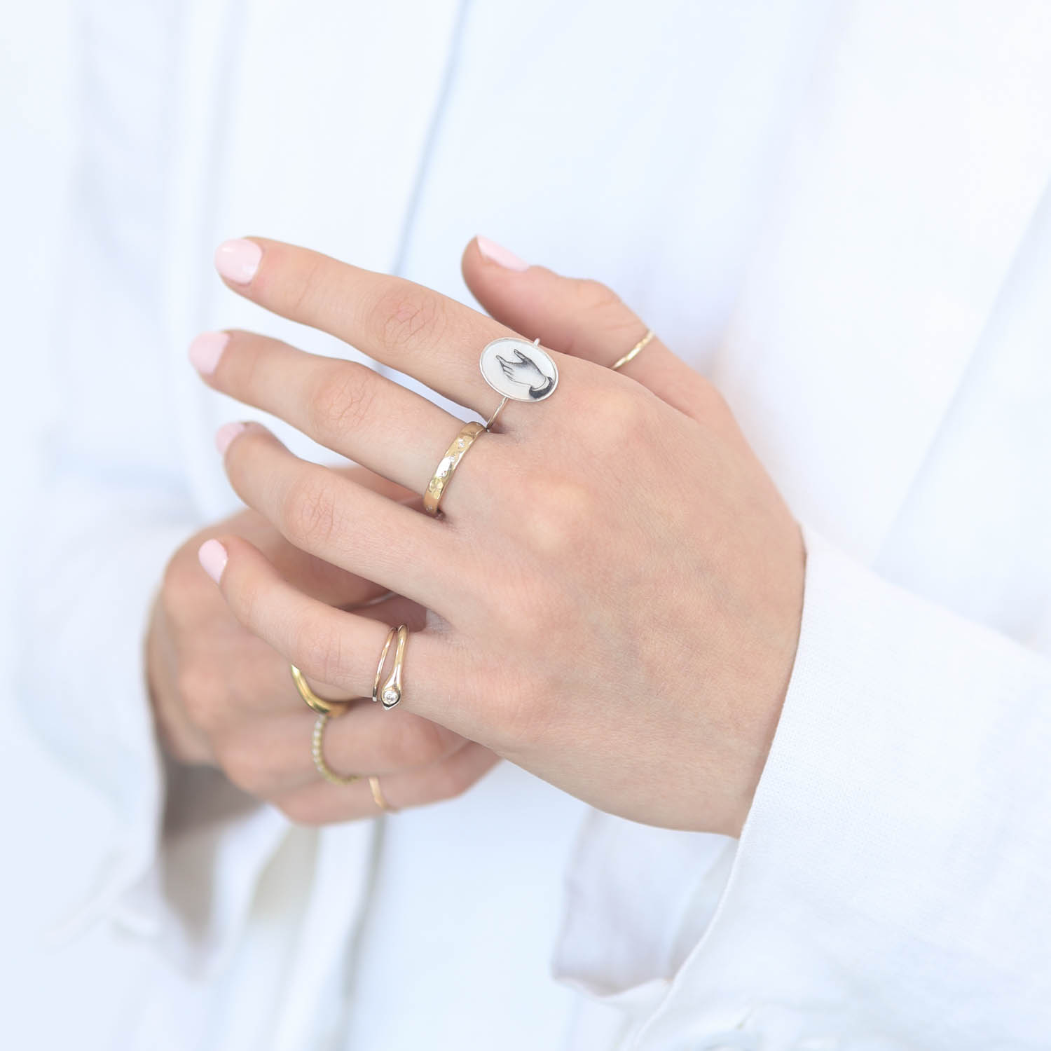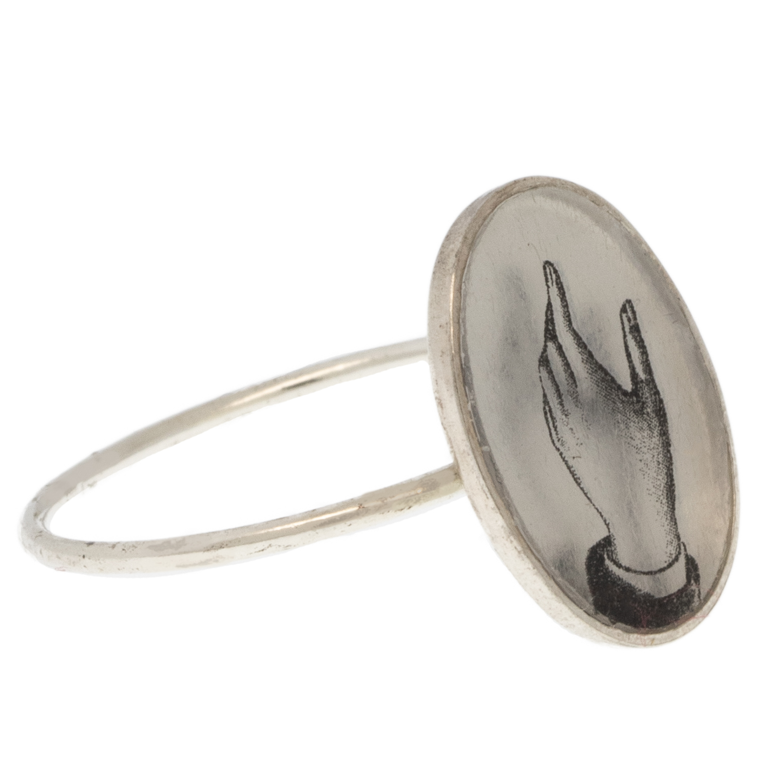This stylish silver band features an oval coin-like face with a plastic surface showcasing a hand-sketched hand design. The intricate detailing adds a unique and personal touch to the ring’s sleek simplicity. Lightweight and versatile, this ring is a delightful statement piece for everyday wear.