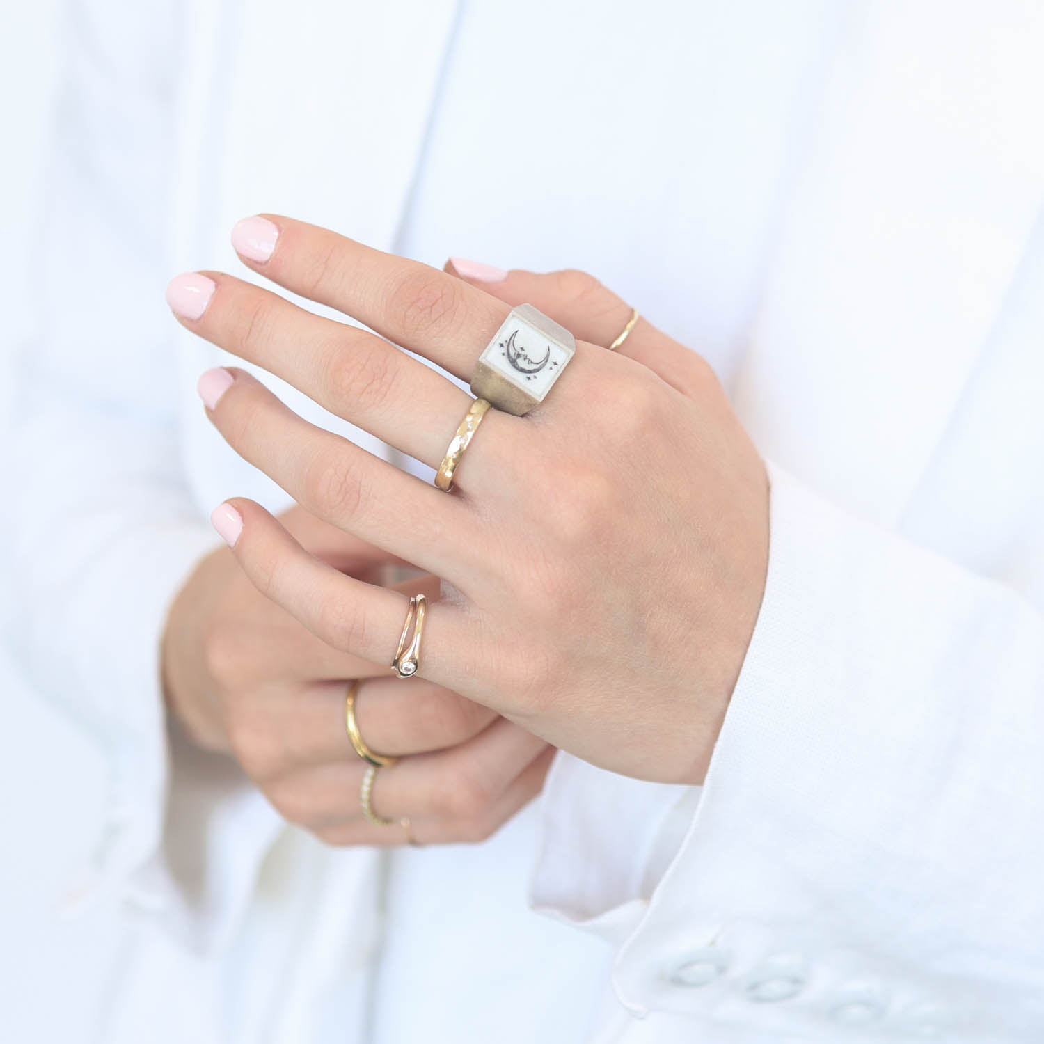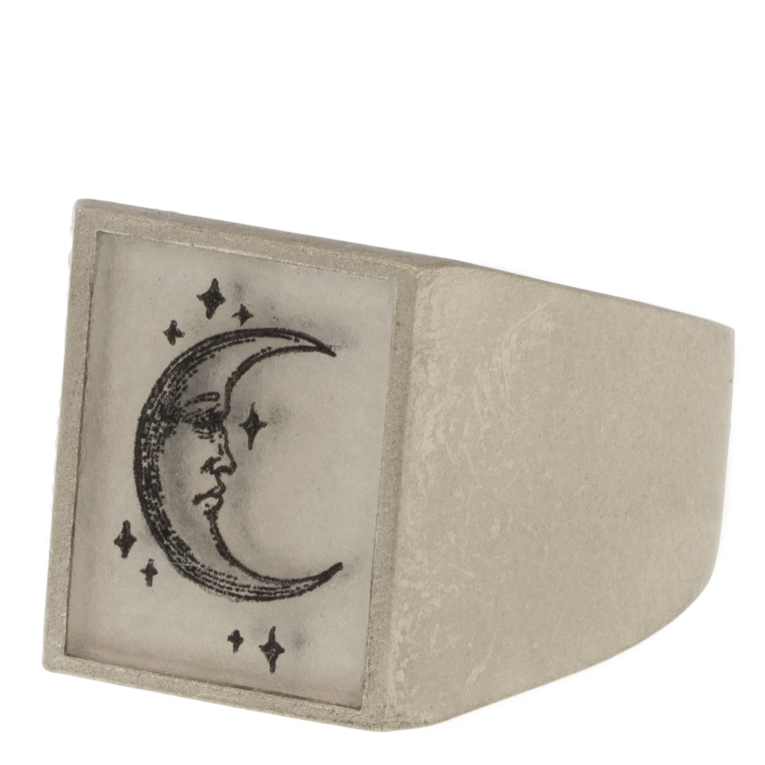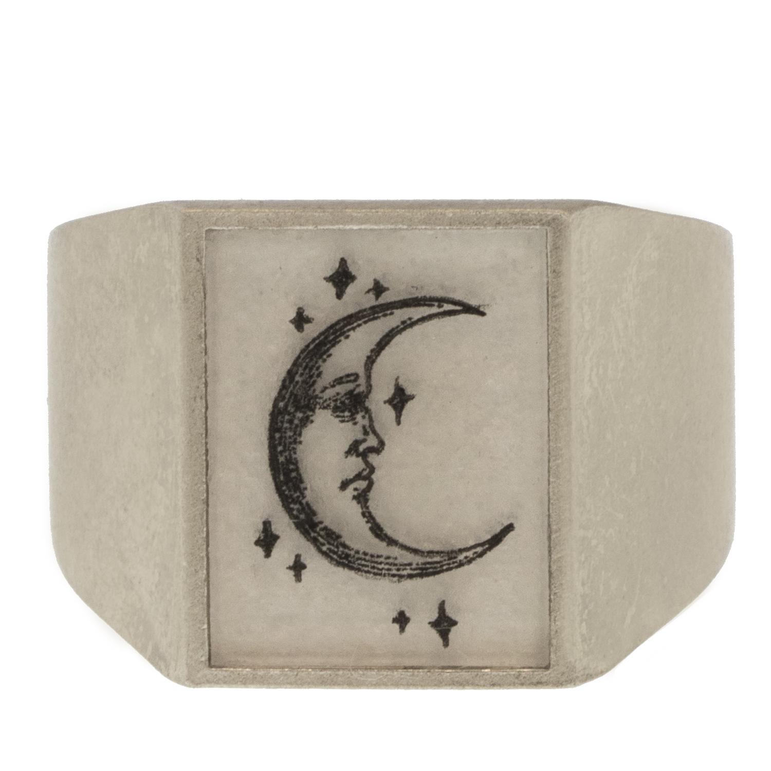 This thick silver statement band features a rectangular face set with a plastic surface adorned with a hand-sketched moon. The intricate design adds a touch of whimsy and celestial-inspired beauty to the ring’s bold silhouette. Perfect for making an impression, this piece beautifully blends elegance and artistry, making it a stunning accessory for any occasion.