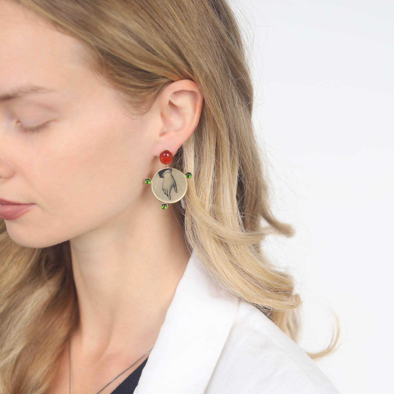These stylish gold earrings feature intricate, realistic hand motifs on a large, durable plastic face. The sleek gold and vibrant hue of the stones emphasize the design’s marriage of simplicity and elegance, complimenting the unique aspect of the hand-sketched artwork.