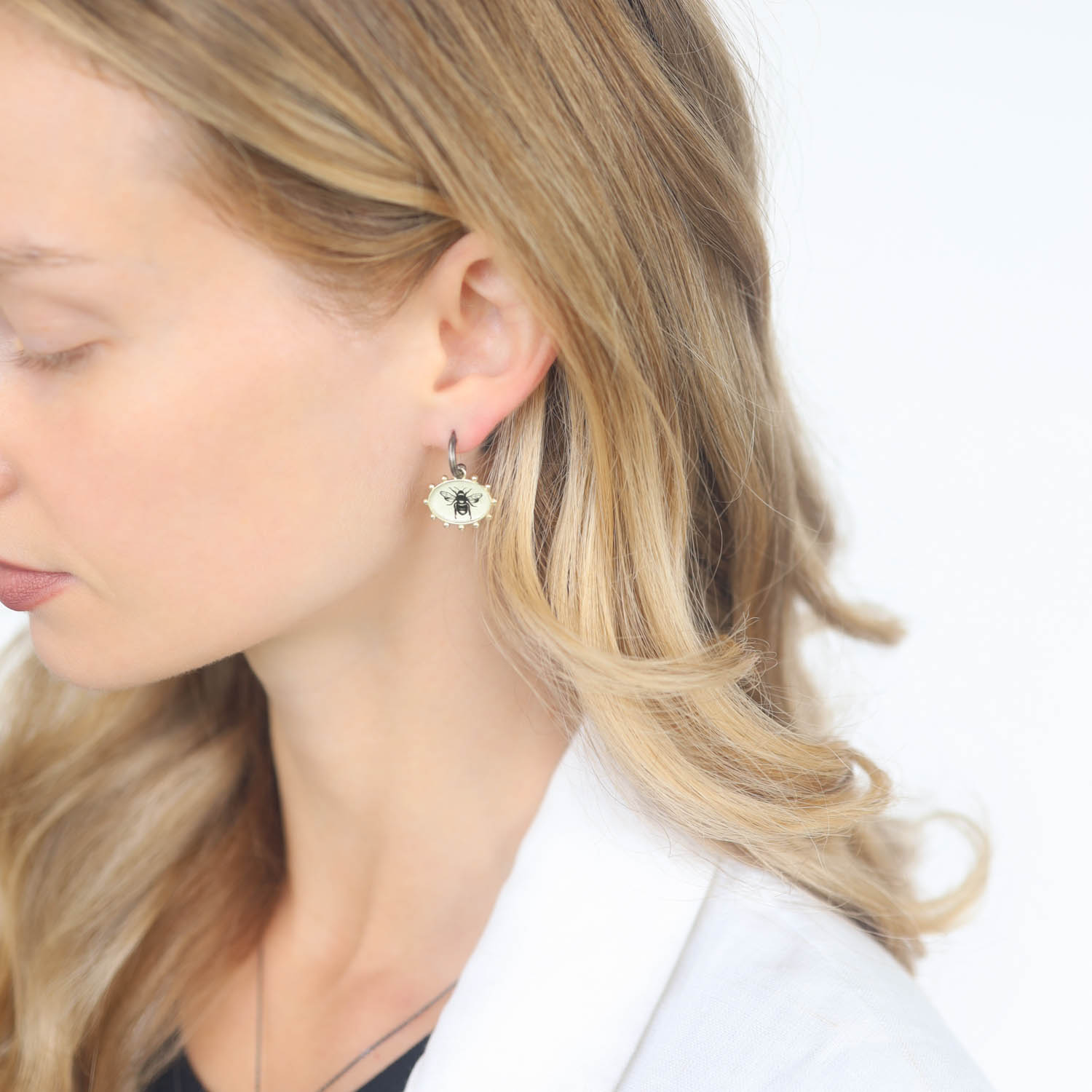 These stylish gold earrings feature a plastic surface showcasing a hand-sketched bumblebee. The intricate details of the bee add a playful touch to the timeless design. The sleek form of the earwire and ornamented border emphasize the design’s marriage of simplicity and elegance, complimenting the unique aspect of the hand-sketched artwork.