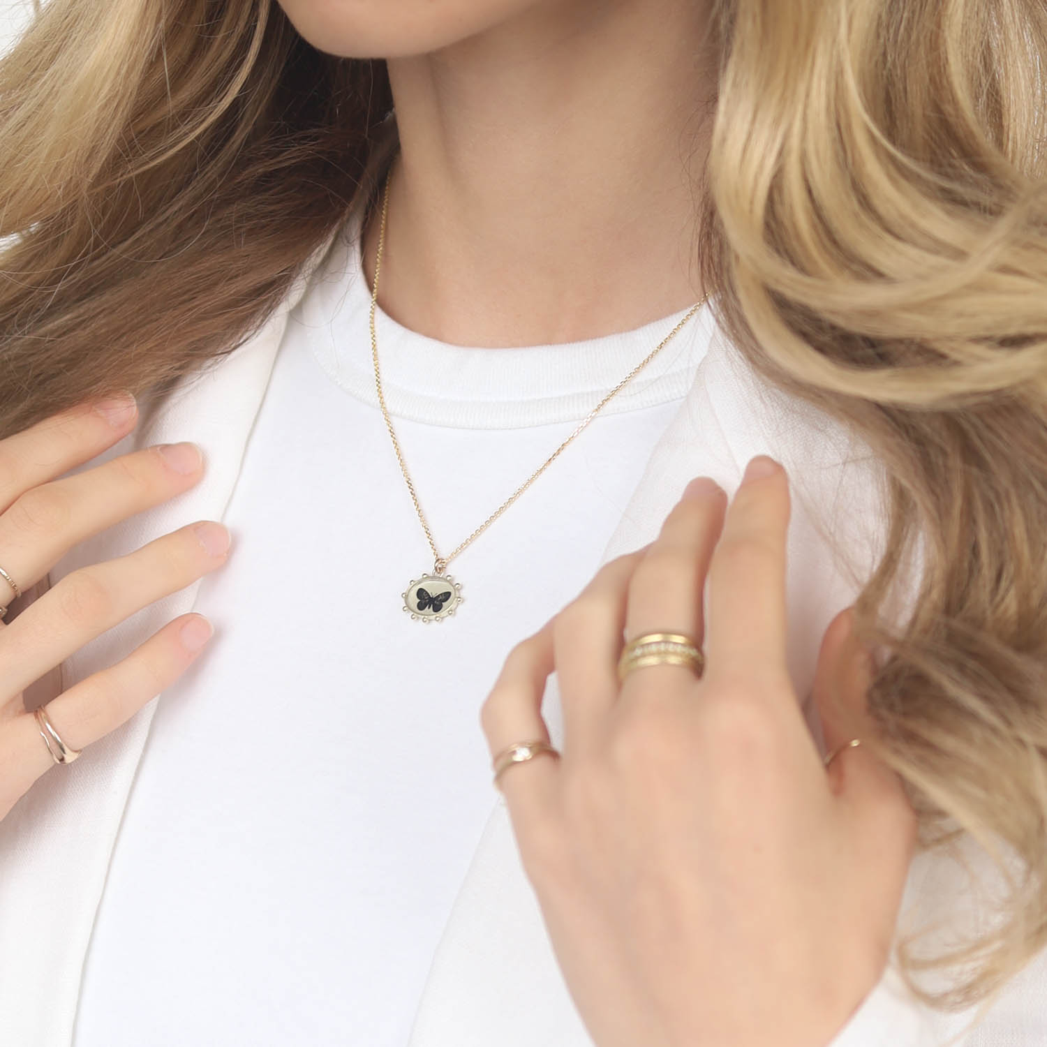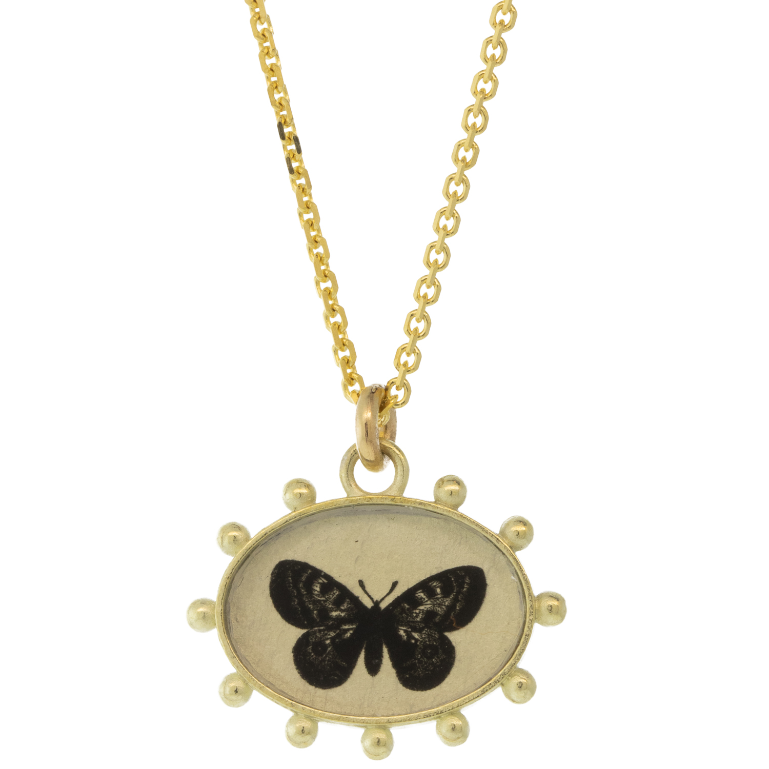 This delightful necklace features a pendant set with a plastic surface showcasing a hand-sketched butterfly. The intricate design captures the grace and beauty of this enchanting creature, making it a lovely statement piece. Suspended from a delicate chain, this necklace adds a touch of whimsy and charm to any outfit, perfect for everyday wear or special occasions.