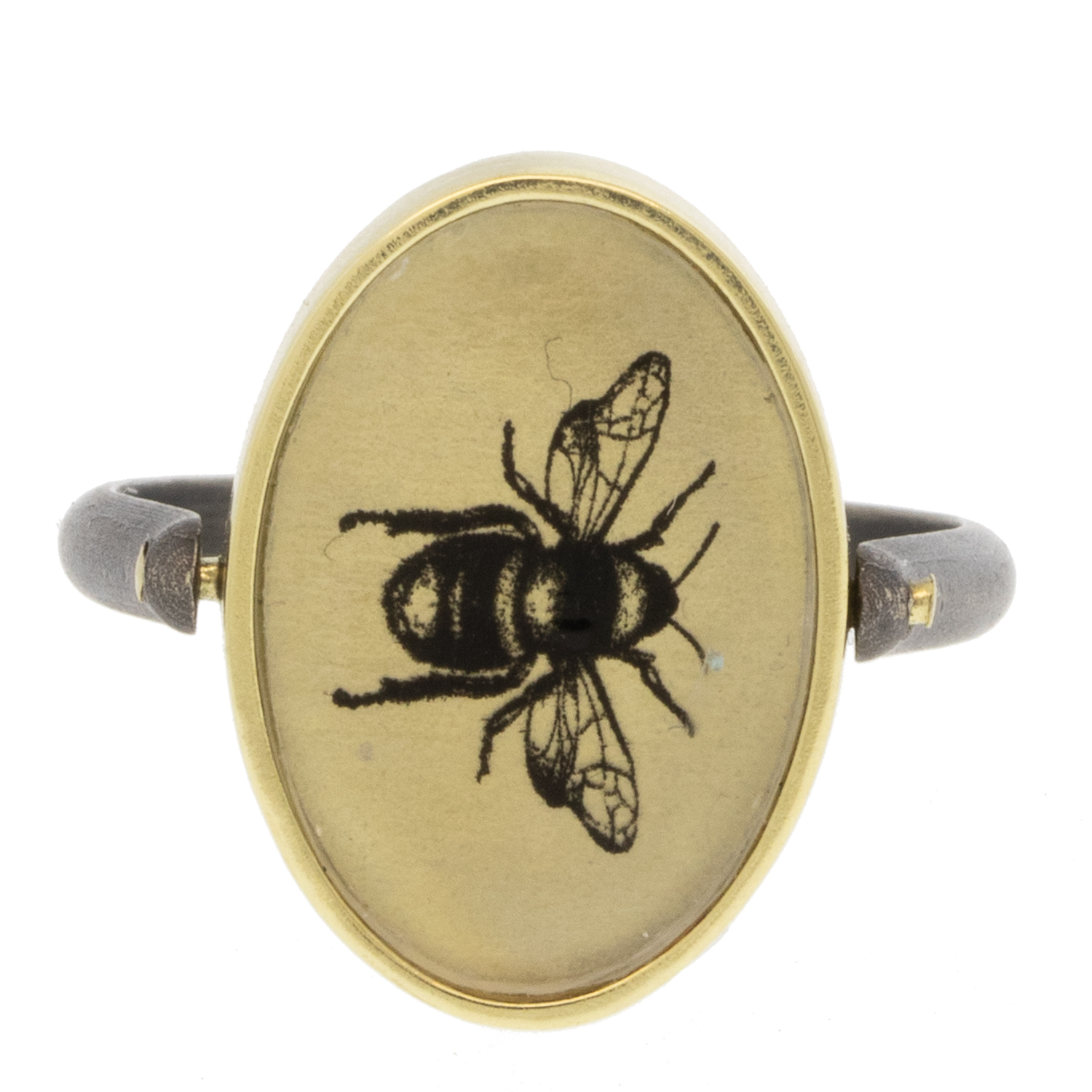 This enchanting gold band features an oval, rotating face, set with a plastic surface, showcasing a hand-sketched rose on one side and a bee on the other. The intricate floral design adds a romantic touch to the sleek simplicity of the band, with a sweet influence from the bee. Lightweight and versatile, this ring is a delightful statement piece for everyday wear that evokes a sense of calm.