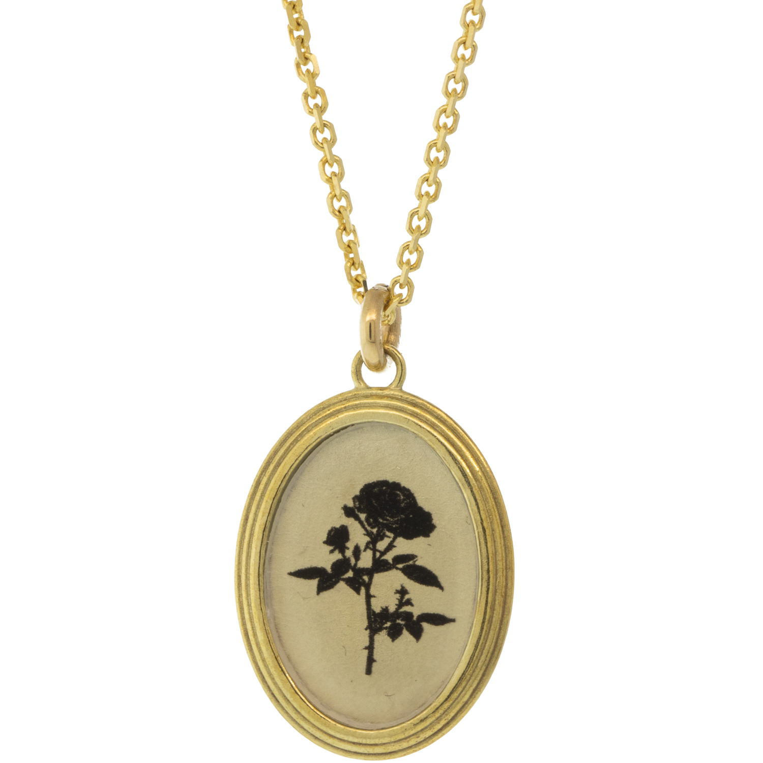 This elegant necklace features an oval pendant, set with a plastic surface, showcasing a hand-sketched rose. The intricate floral design adds a touch of romance and sophistication, making it a beautiful statement piece. Suspended from a delicate chain, this necklace effortlessly enhances any outfit, perfect for both everyday wear and special occasions.