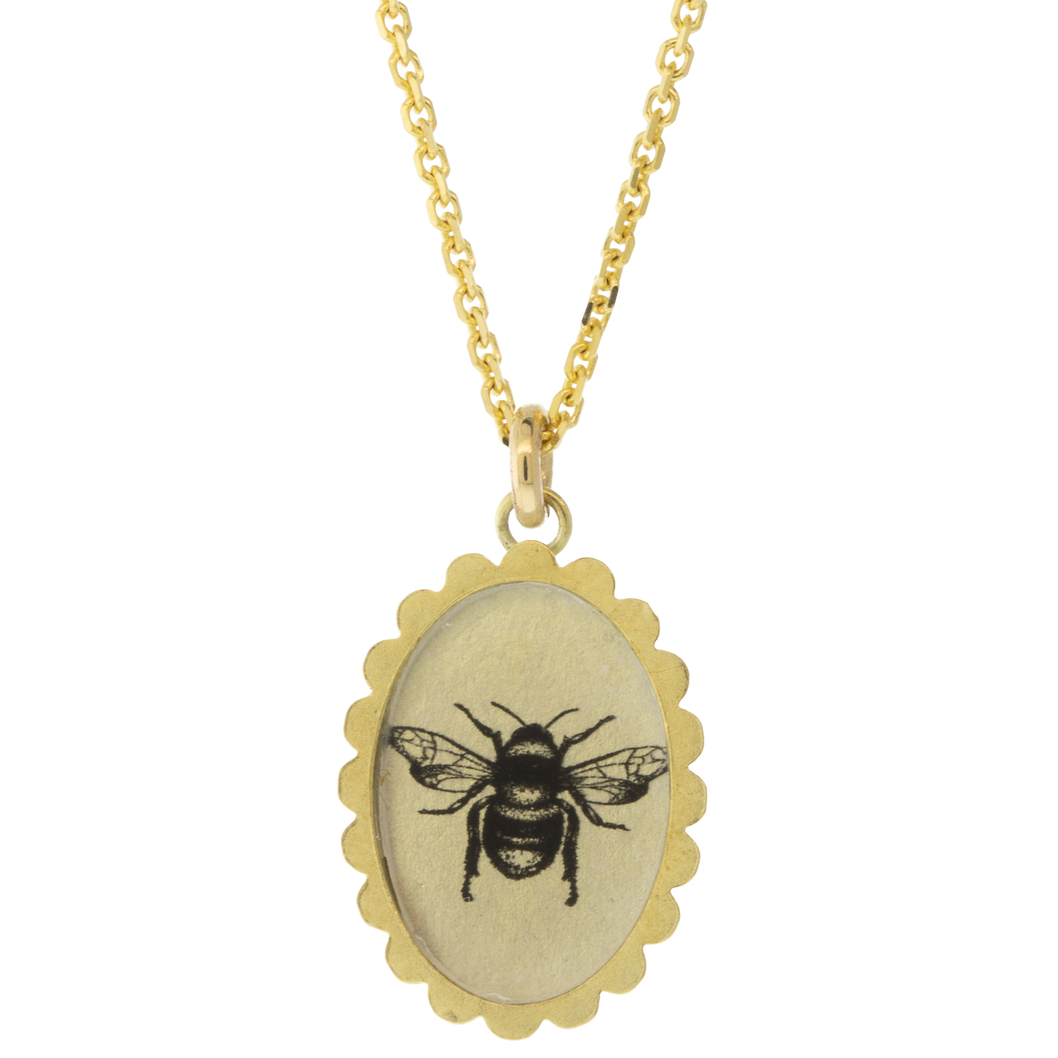 This charming necklace features a pendant set with a plastic surface showcasing a hand-sketched bumblebee. The delightful design captures the playful essence of nature, making it a whimsical statement piece. Suspended from a delicate chain, this necklace adds a touch of sweetness to any outfit, perfect for everyday wear or special occasions.