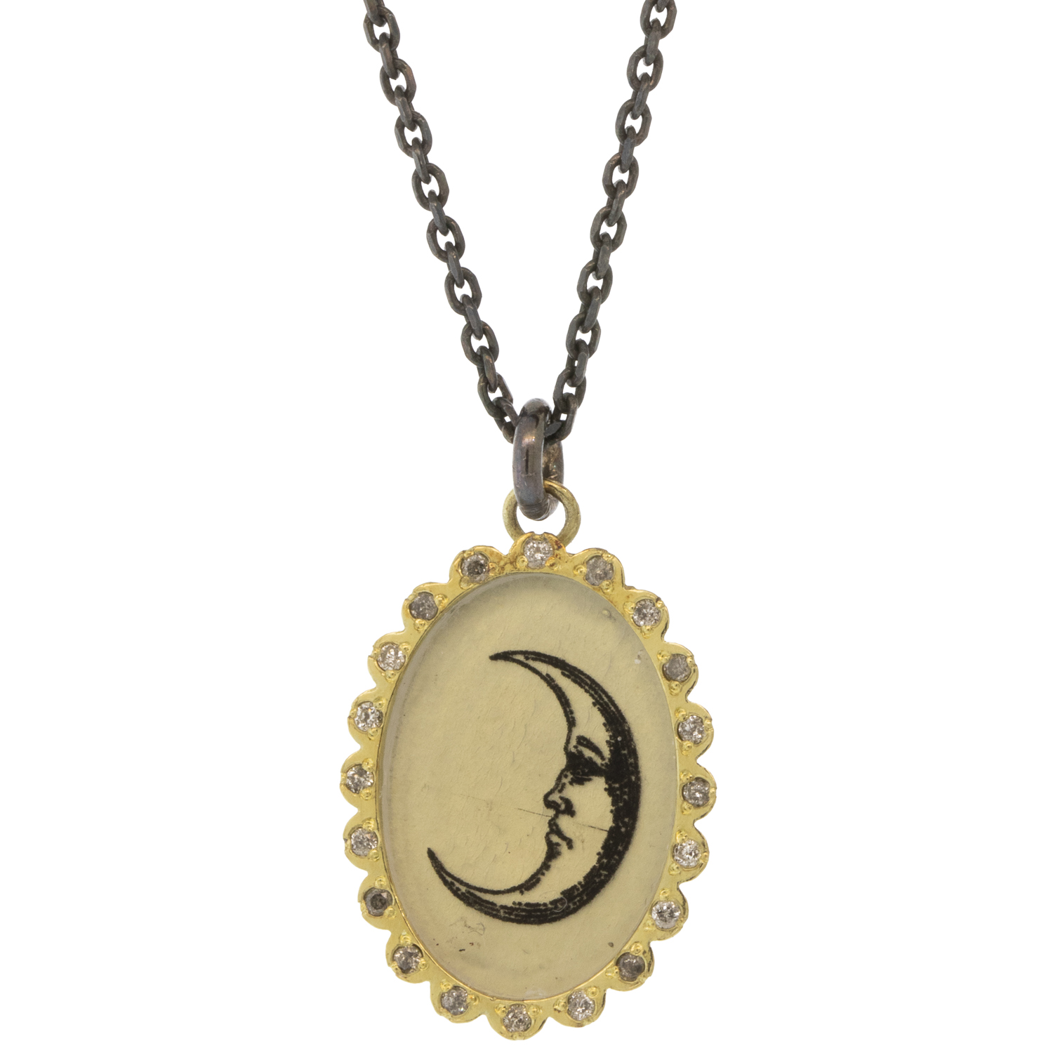 This two-tone, enchanting necklace features an oval pendant set with a plastic surface showcasing a hand-sketched moon. The intricate design evokes a sense of mystery and magic, making it a captivating statement piece. Suspended from a delicate silver chain, this necklace adds a touch of celestial charm to any outfit, perfect for both everyday wear and special occasions.