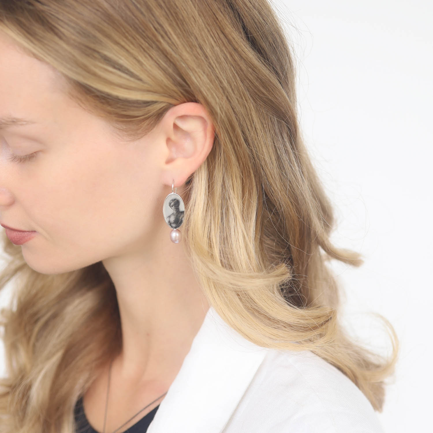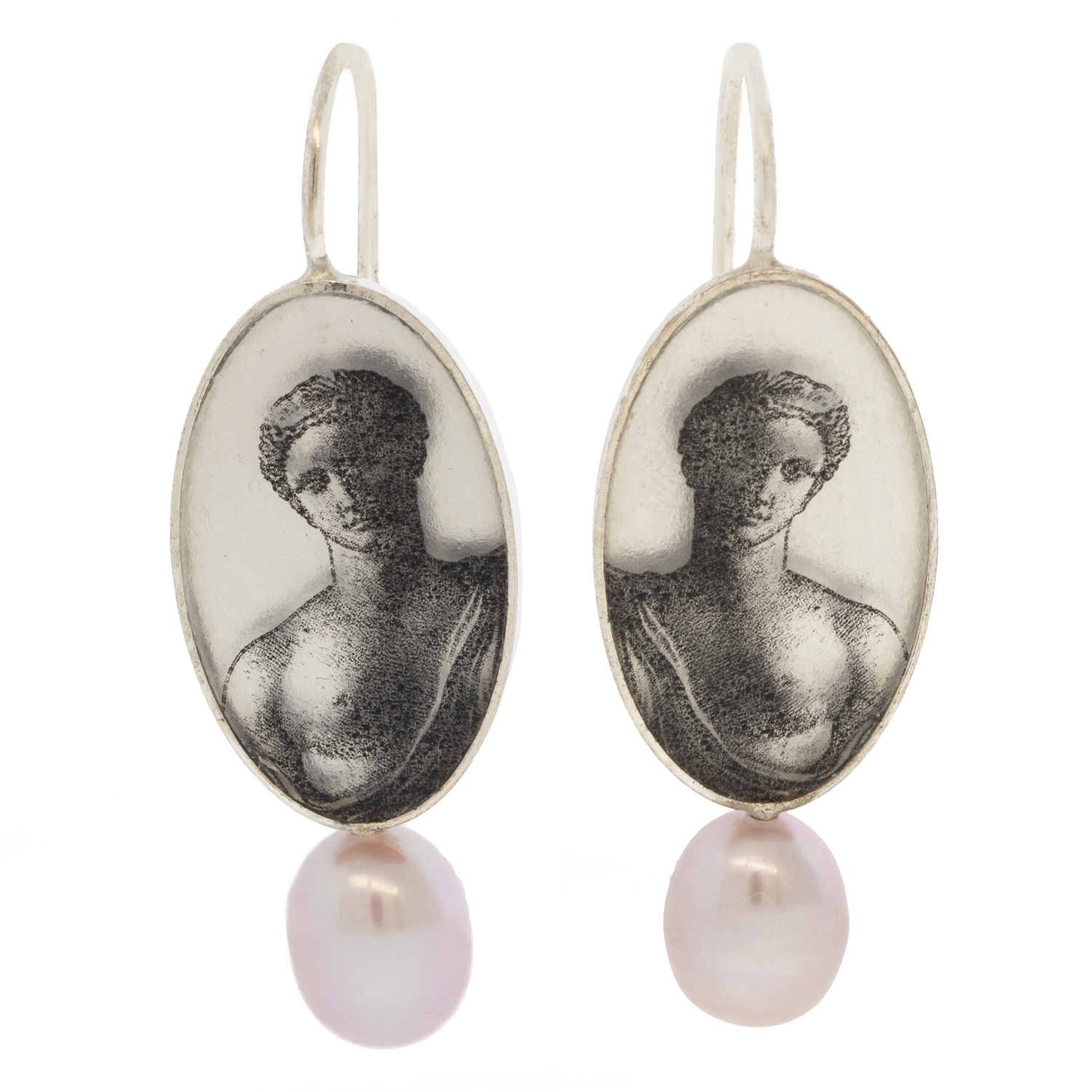 These stylish silver earrings feature intricate Aphrodite motifs on a durable plastic face. The addition of a smooth pearl drop and sleek border emphasize the design’s marriage of simplicity and elegance, complimenting the unique aspect of the hand-sketched artwork.