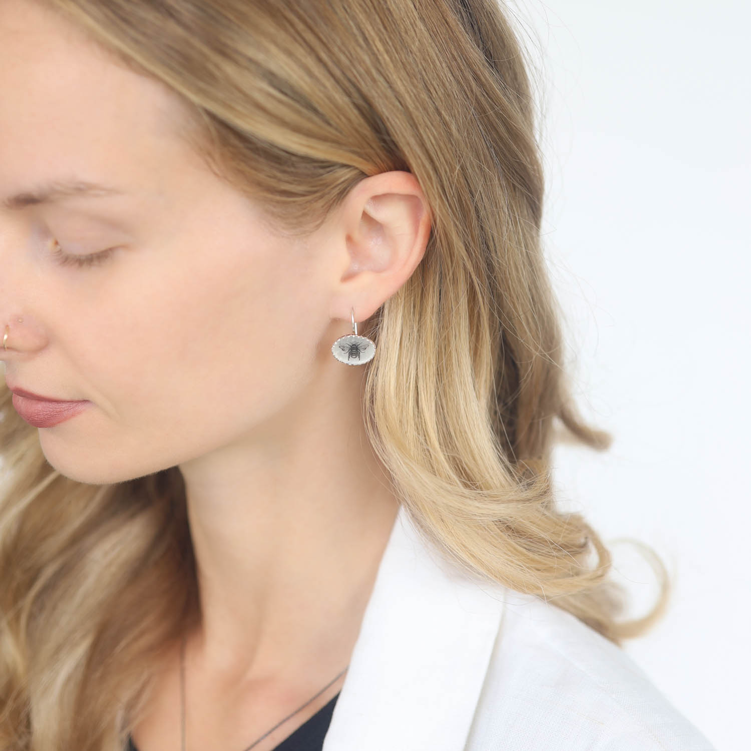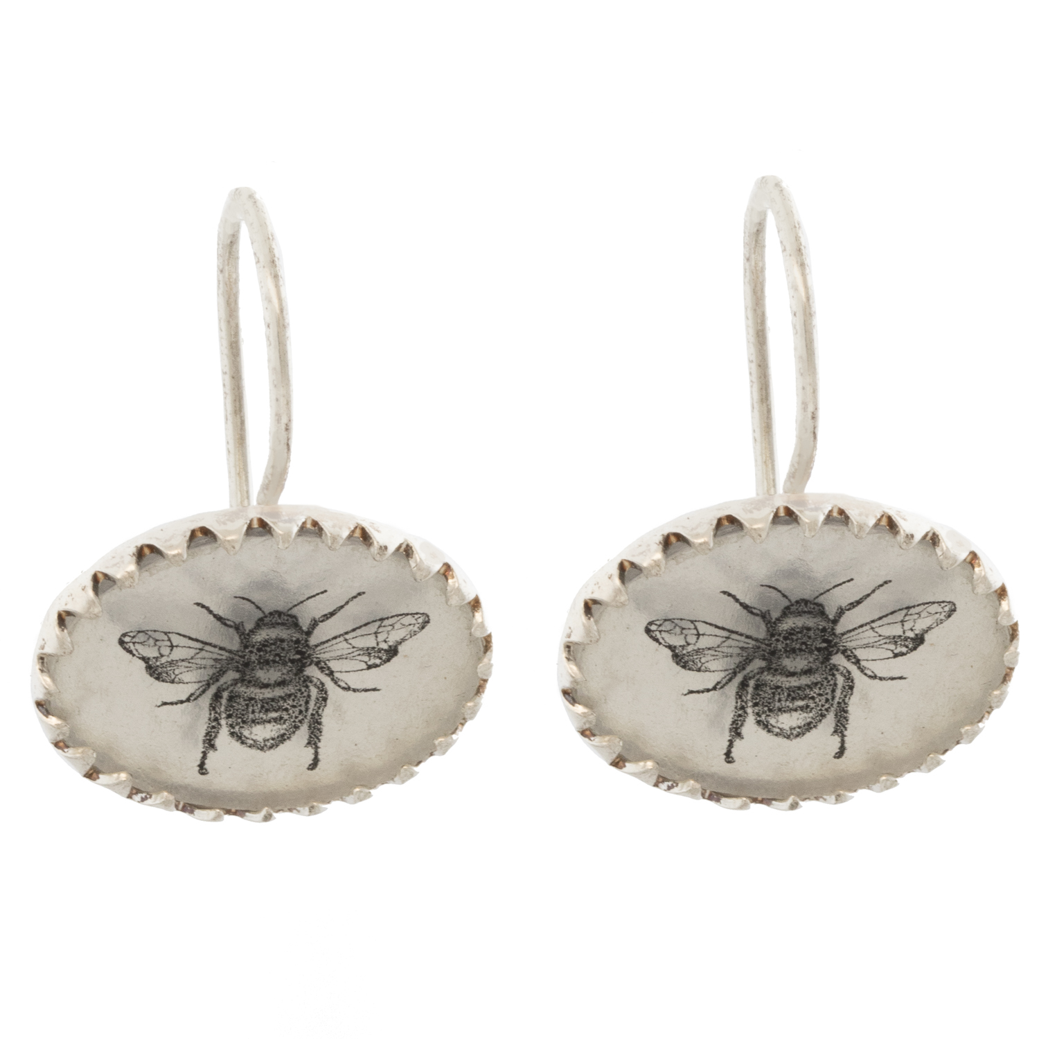 These stylish silver earrings feature intricate, realistic bee motifs on a durable plastic face. The sleek form of the earwire and ornamented border emphasize the design’s marriage of simplicity and elegance, complimenting the unique aspect of the hand-sketched artwork.