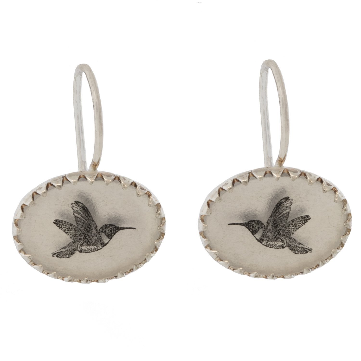 These stylish silver earrings feature intricate, realistic hummingbird motifs on a durable plastic face. The sleek form of the earwire and ornamented border emphasize the design’s marriage of simplicity and elegance, complimenting the unique aspect of the hand-sketched artwork.