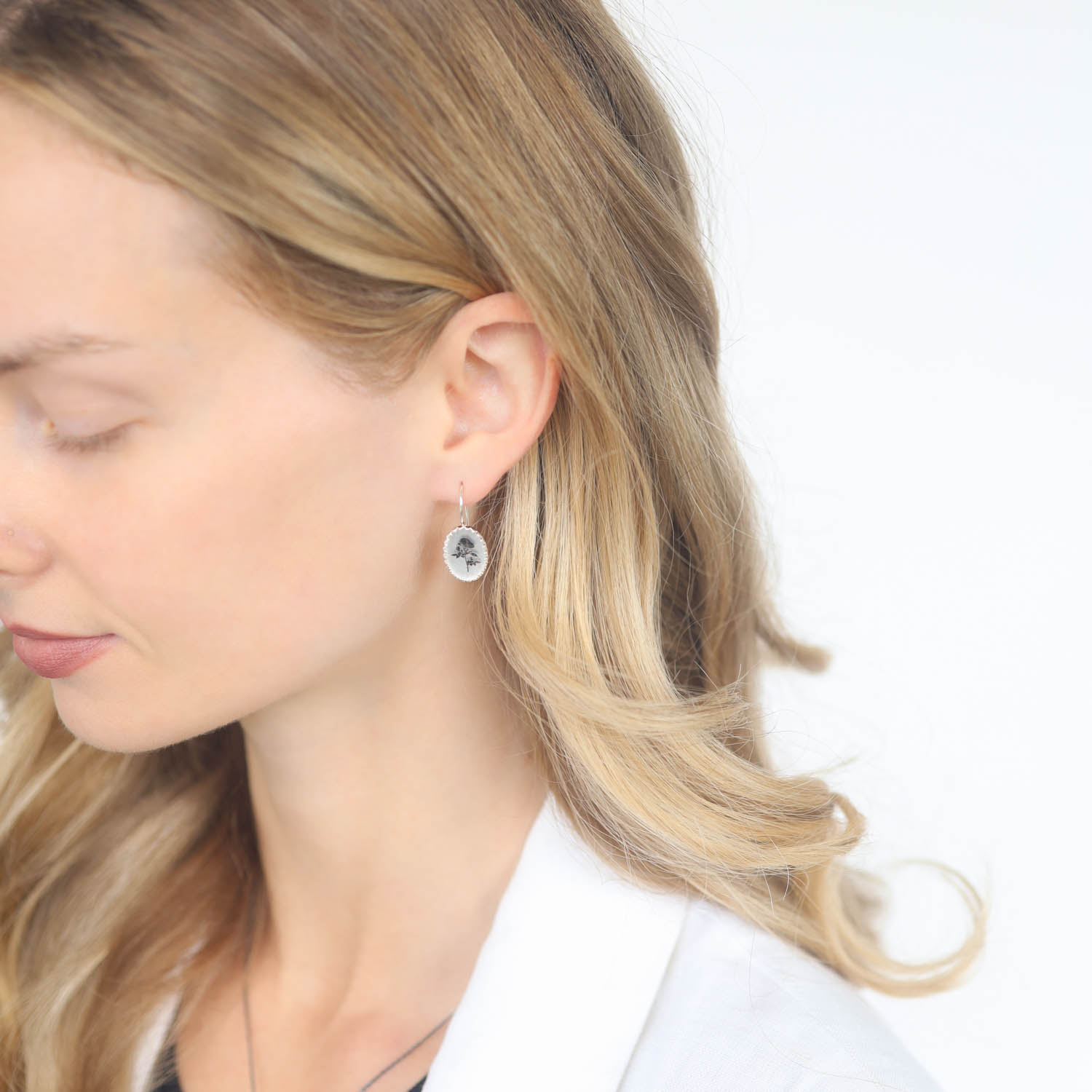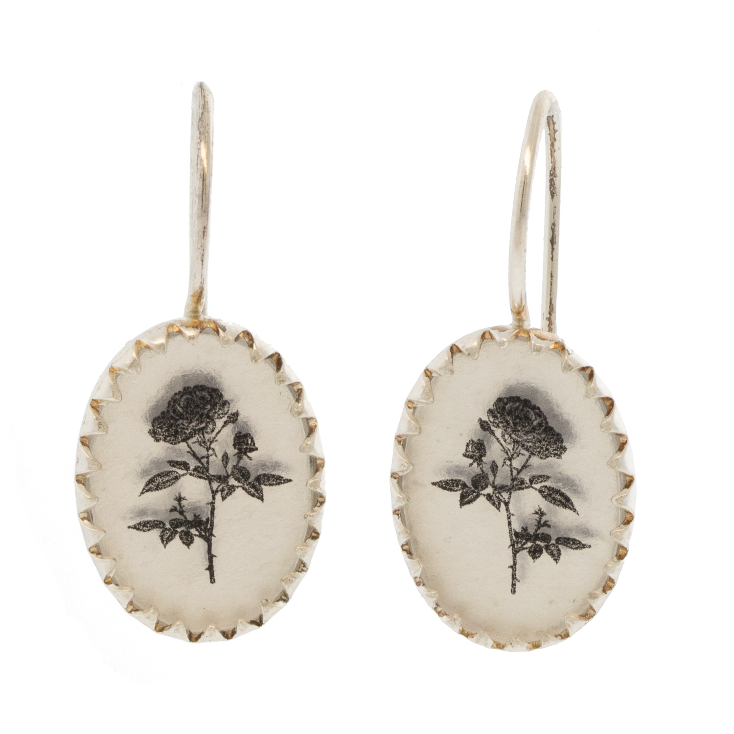 These stylish silver earrings feature intricate, realistic rose motifs on a durable plastic face. The sleek form of the earwire and ornamented border emphasize the design’s marriage of simplicity and elegance, complimenting the unique aspect of the hand-sketched artwork.