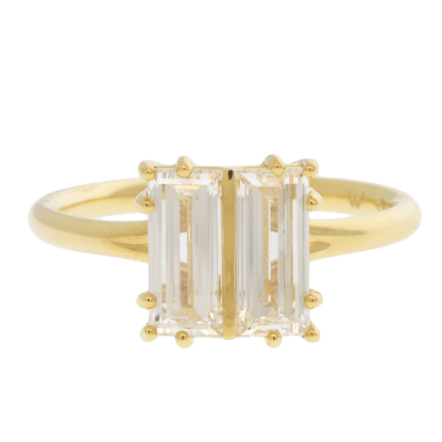 A modern stunner, this ring features two elongated emerald-cut stones set side-by-side, creating a striking mirrored silhouette. Clean lines and warm yellow gold come together in a bold yet refined design that dazzles from every angle.