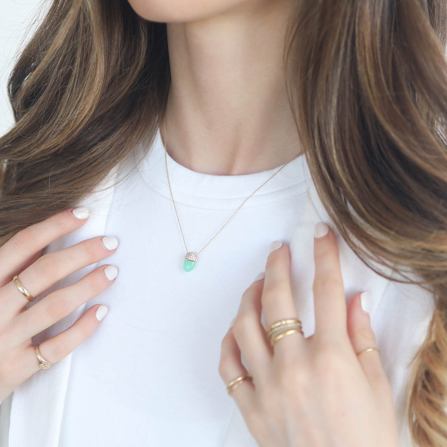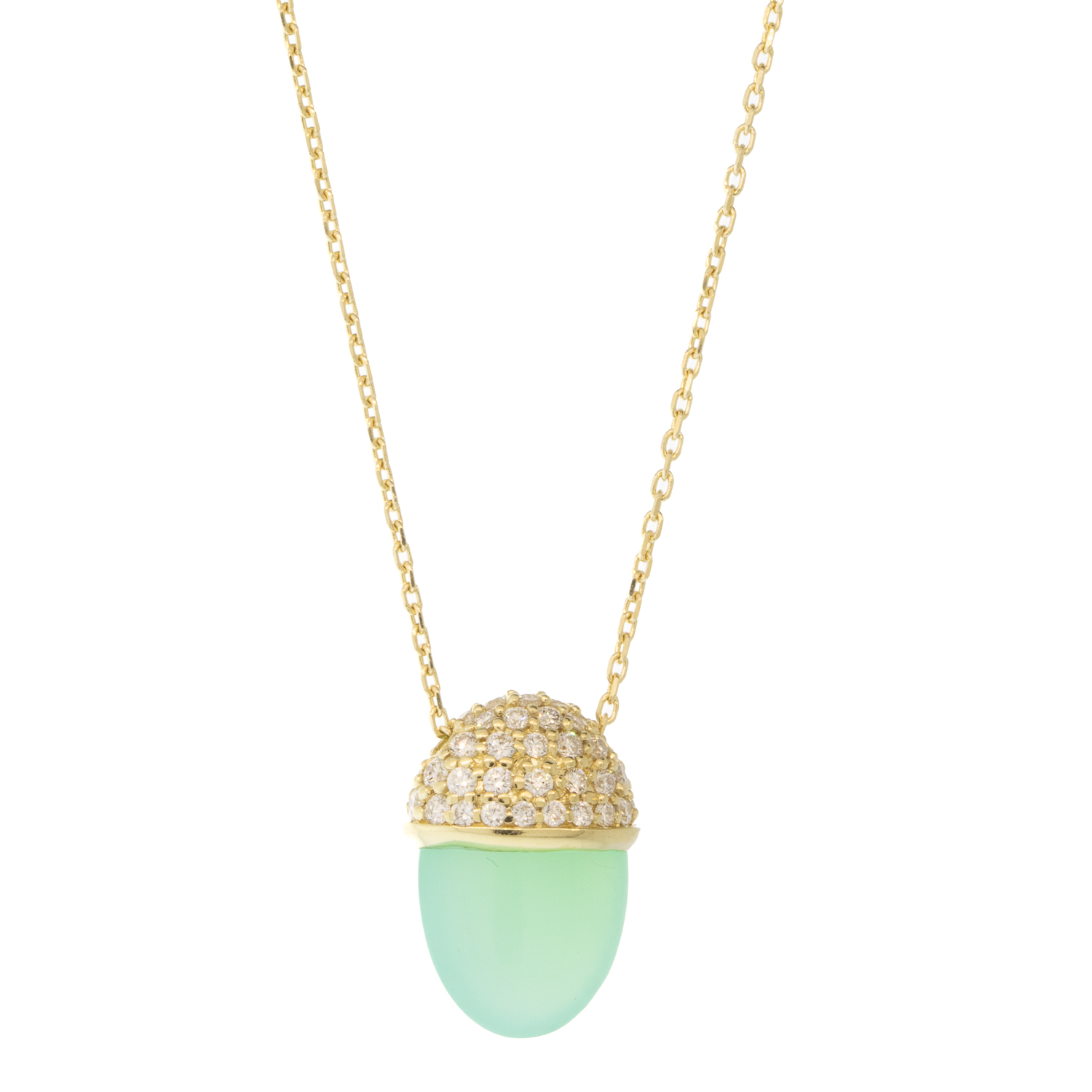An acorn-like cap, layered with petite twinkling diamonds gives an elegant touch to this vibrant chrysoprase stone, suspended by a delicate, graceful chain.
