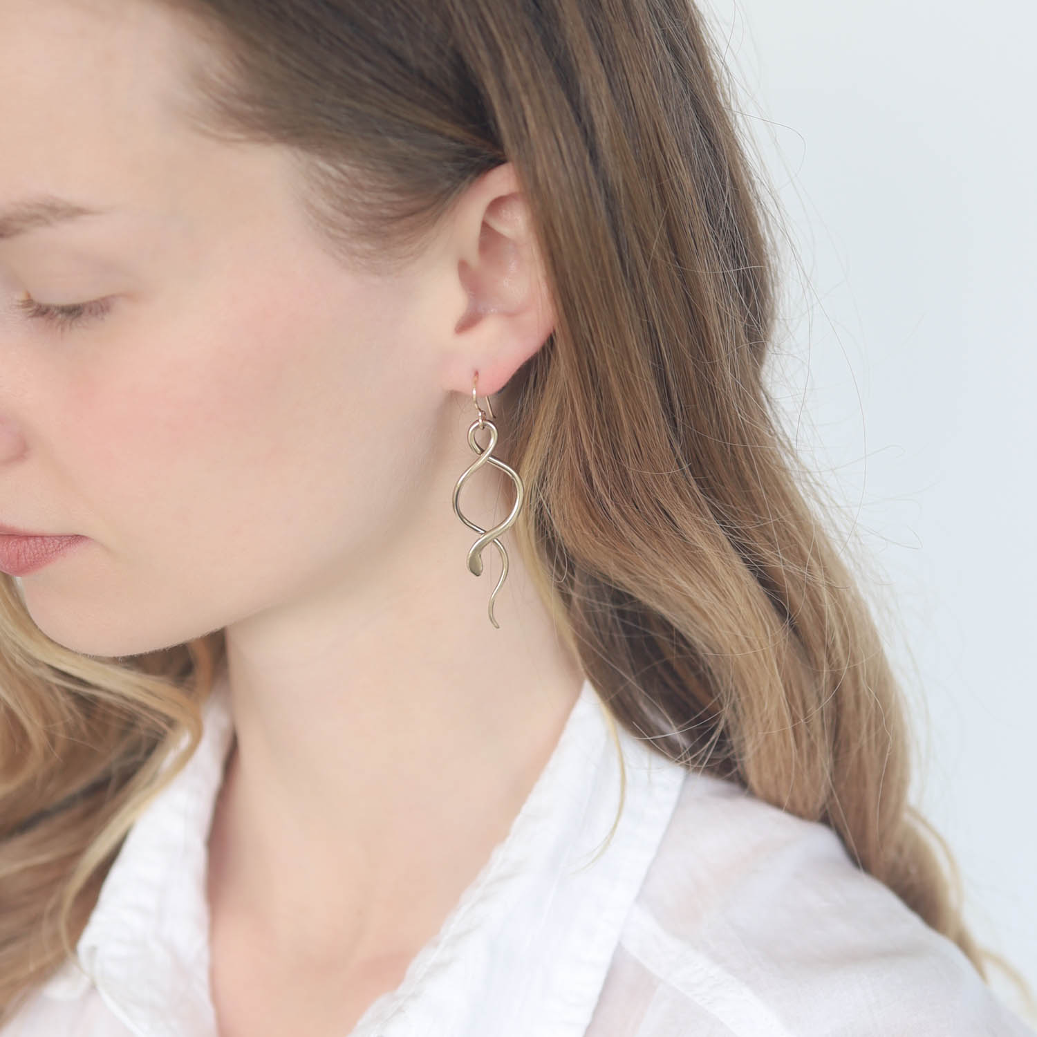 Sleek and modern, these elegant gold-hued serpent dangle earrings make a statement with minimal effort.