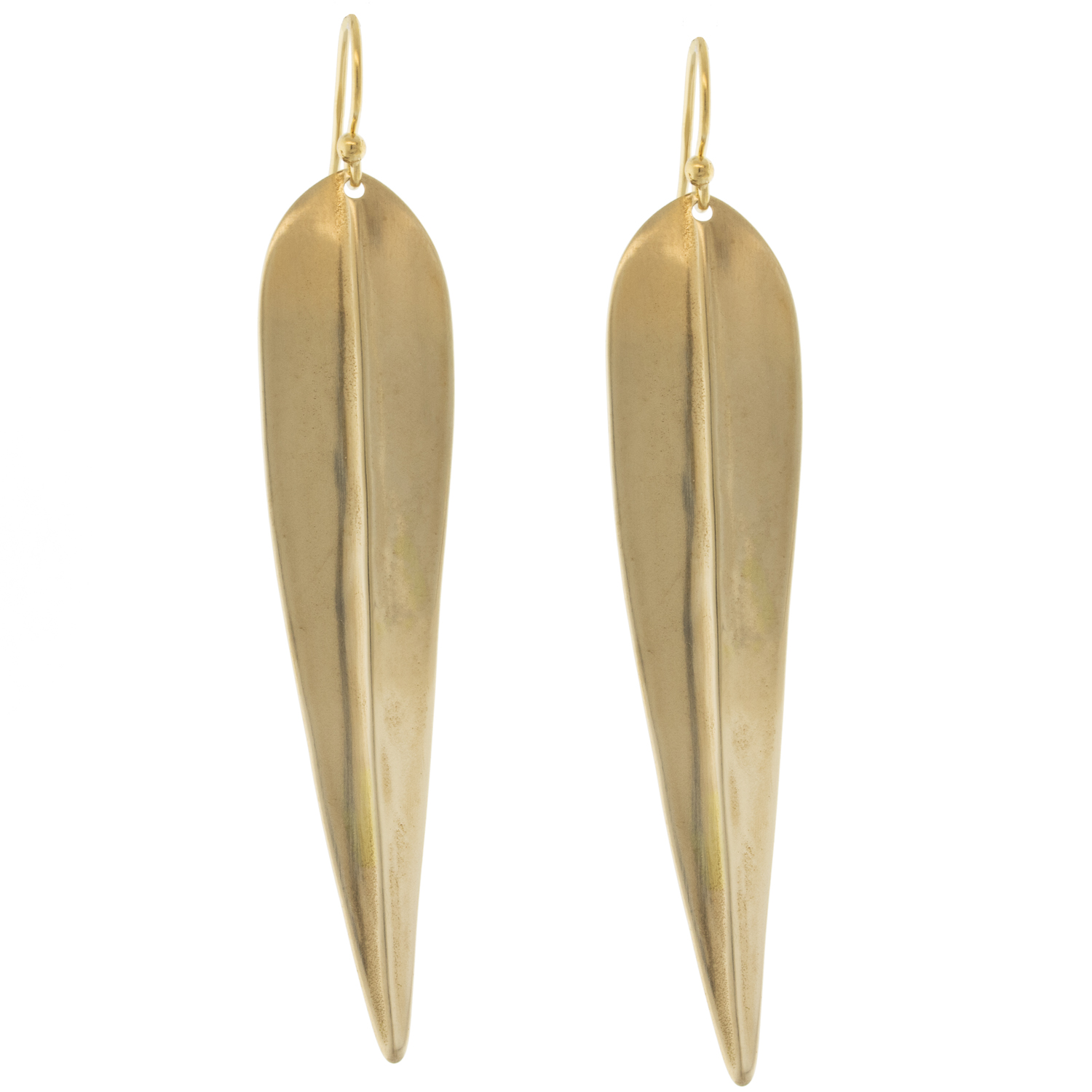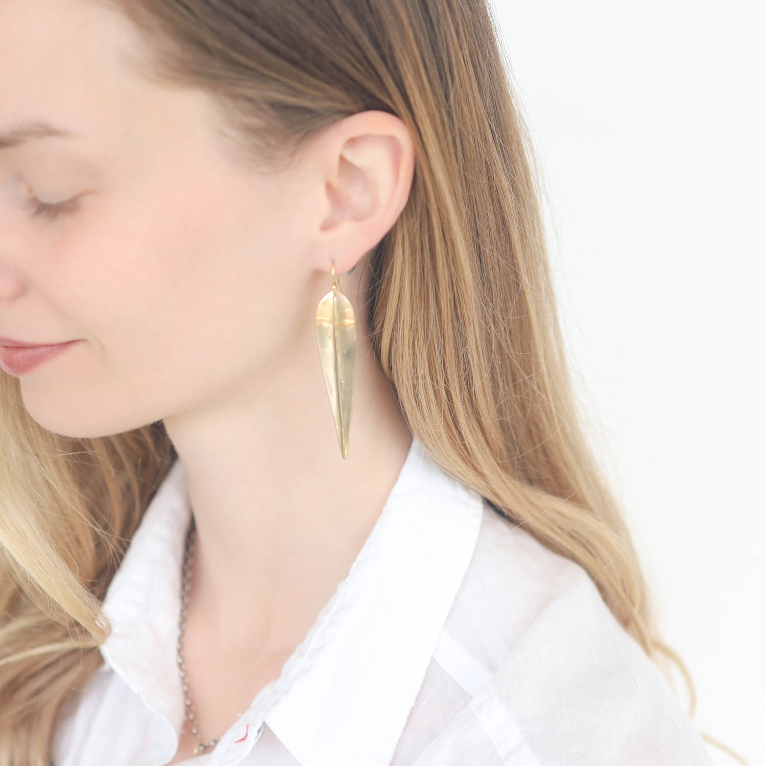 Sleek and modern, these elegant gold-hued leaf earrings make a statement with minimal effort.