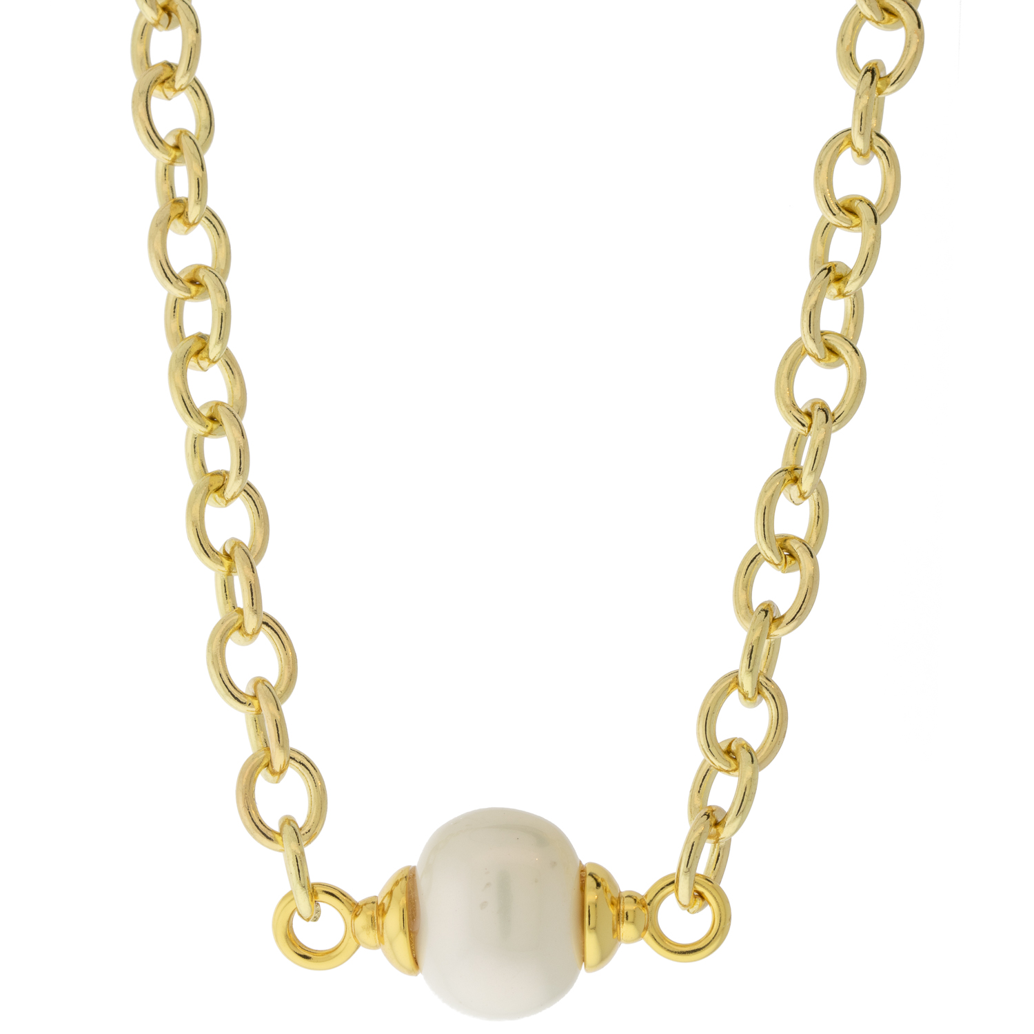 A stunning white mother of pearl bead, capped on either side in rich yellow gold, on a thick chain is perfect for adding a touch of elegance and sophistication to any look.