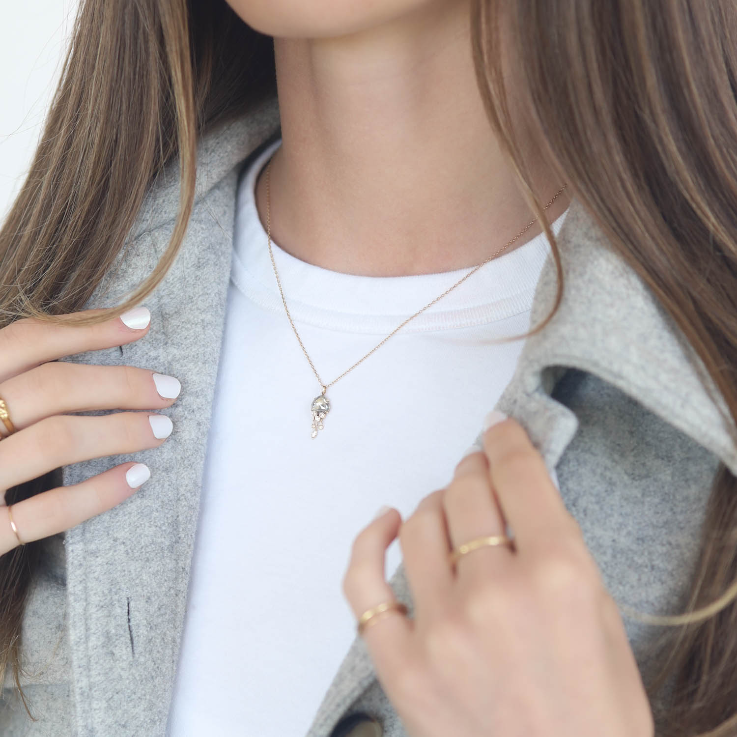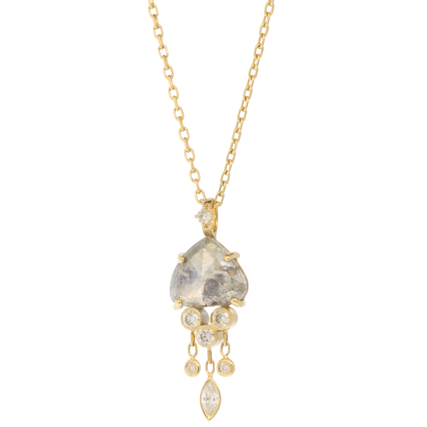 Celine Daoust’s jewelry tells a tale of alchemy and ancient magic, seamlessly blending the enduring power of gold with the light and energy of natural stones. This necklace features a breathtaking grey diamond slice, enhanced by delicate, dangling bezeled diamonds that evoke the ethereal beauty of a jellyfish.