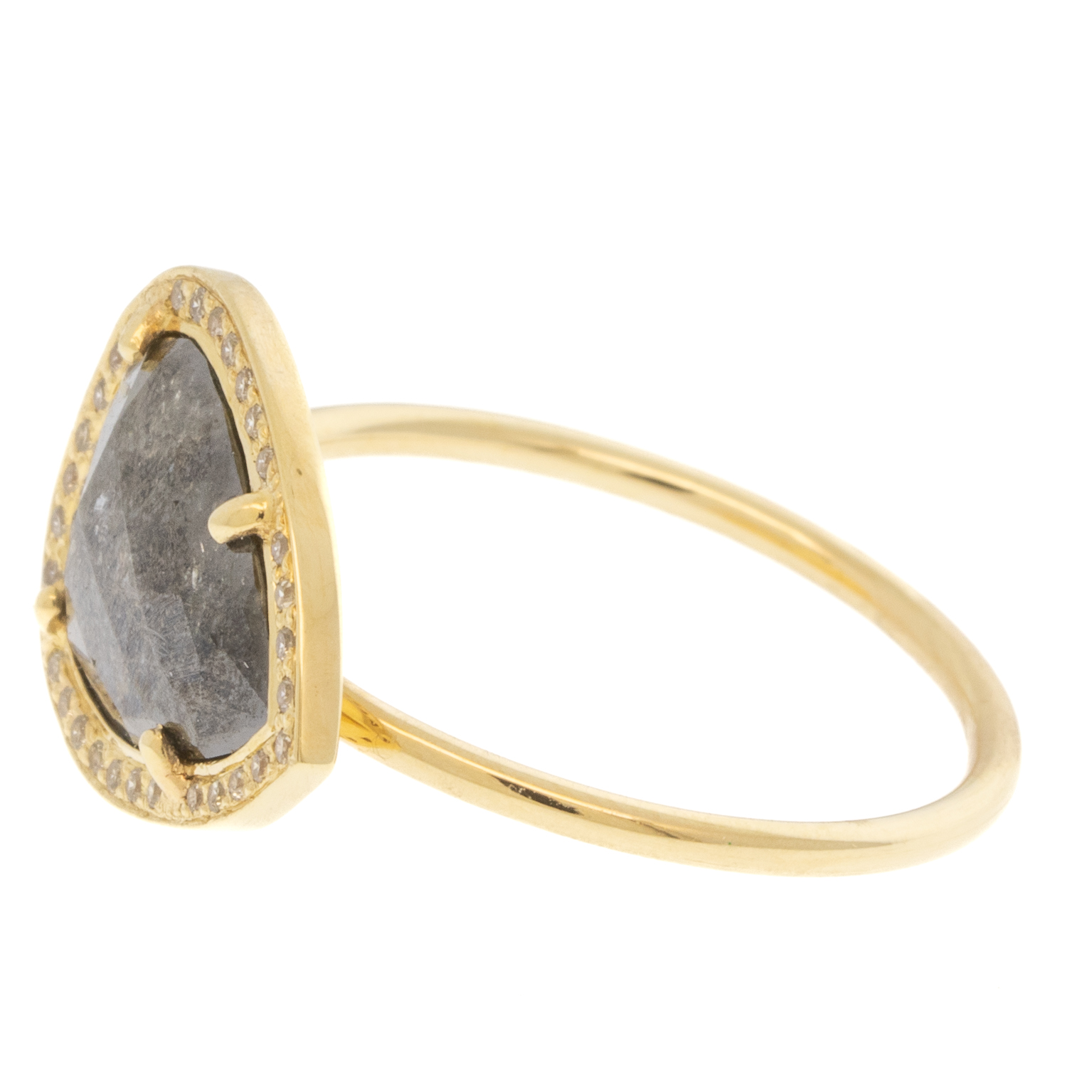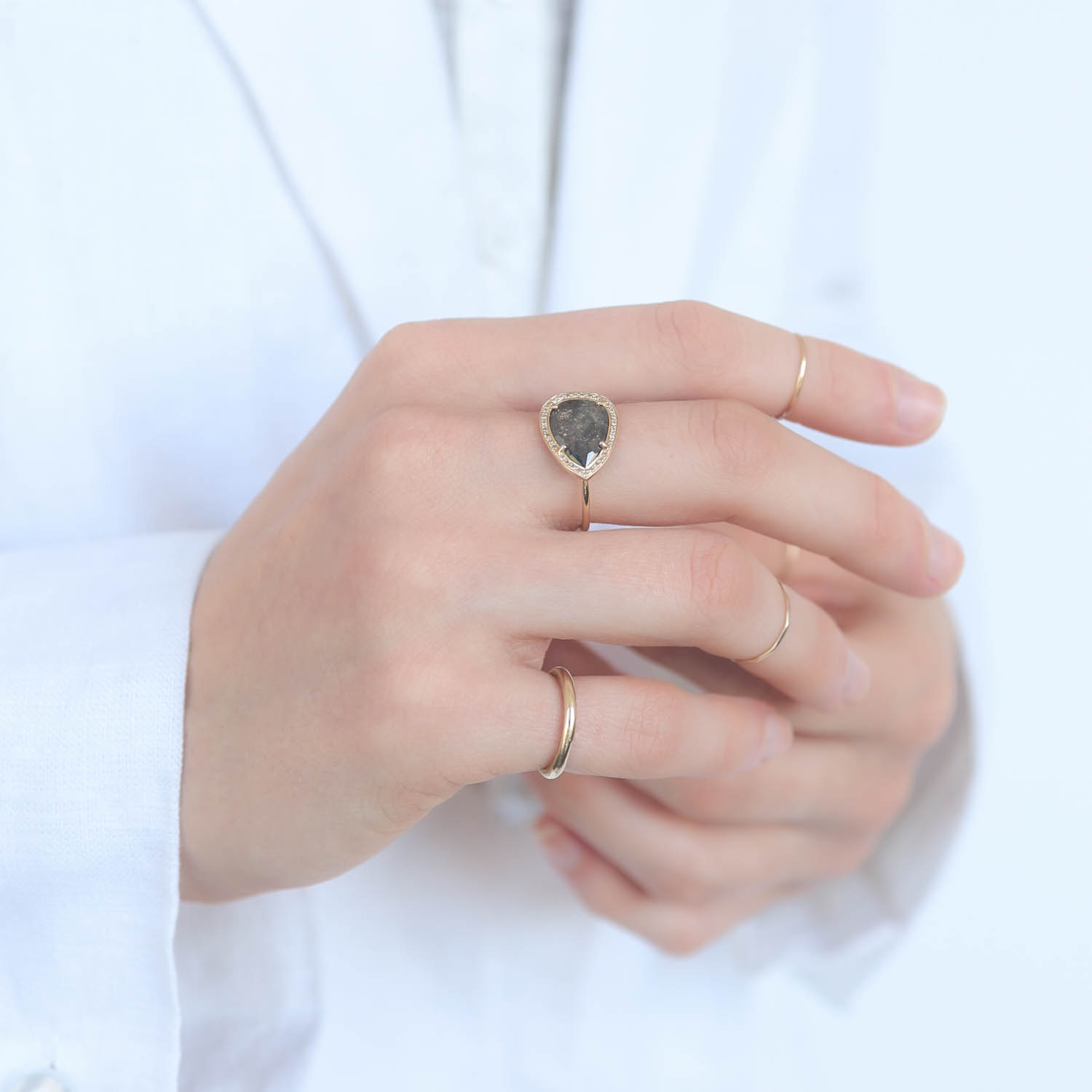 Celine Daoust’s jewelry is a story of alchemy and ancient magic. It joins together the power that gold has long given those who wear it with the light and energy of natural stones. This one-of-a-kind ring is enhanced by a frame of shimmering diamonds that act as a halo around an incredible diamond slice.