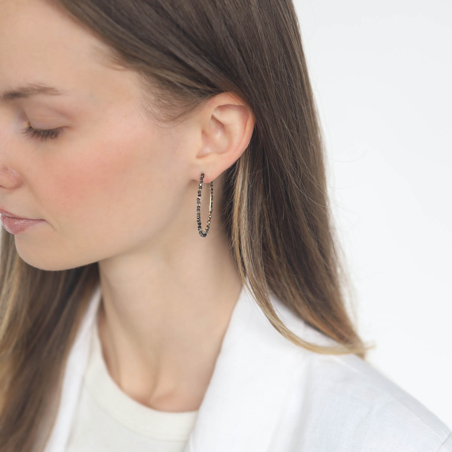 Dark crystals follow the slope of these oval hoops putting a fun, modern twist on a classic look.