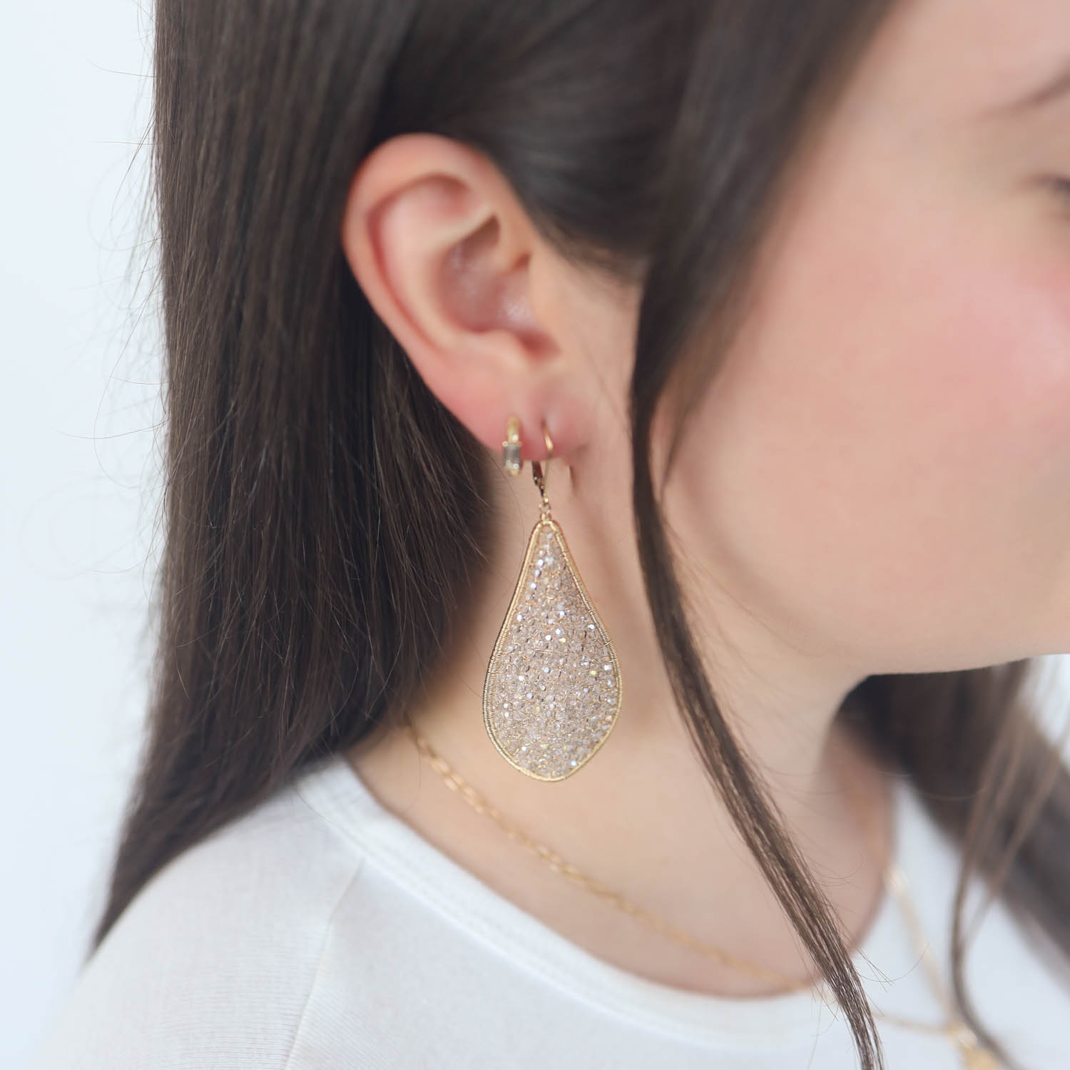 Shimmering crystals are meticulously woven with threads of gold, allowing each bead to reflect facets of light with every turn. Lovely and ethereal enough to wear as a wedding earring or to any of your most glamorous events (or on an everyday basis… we wouldn’t blame you).