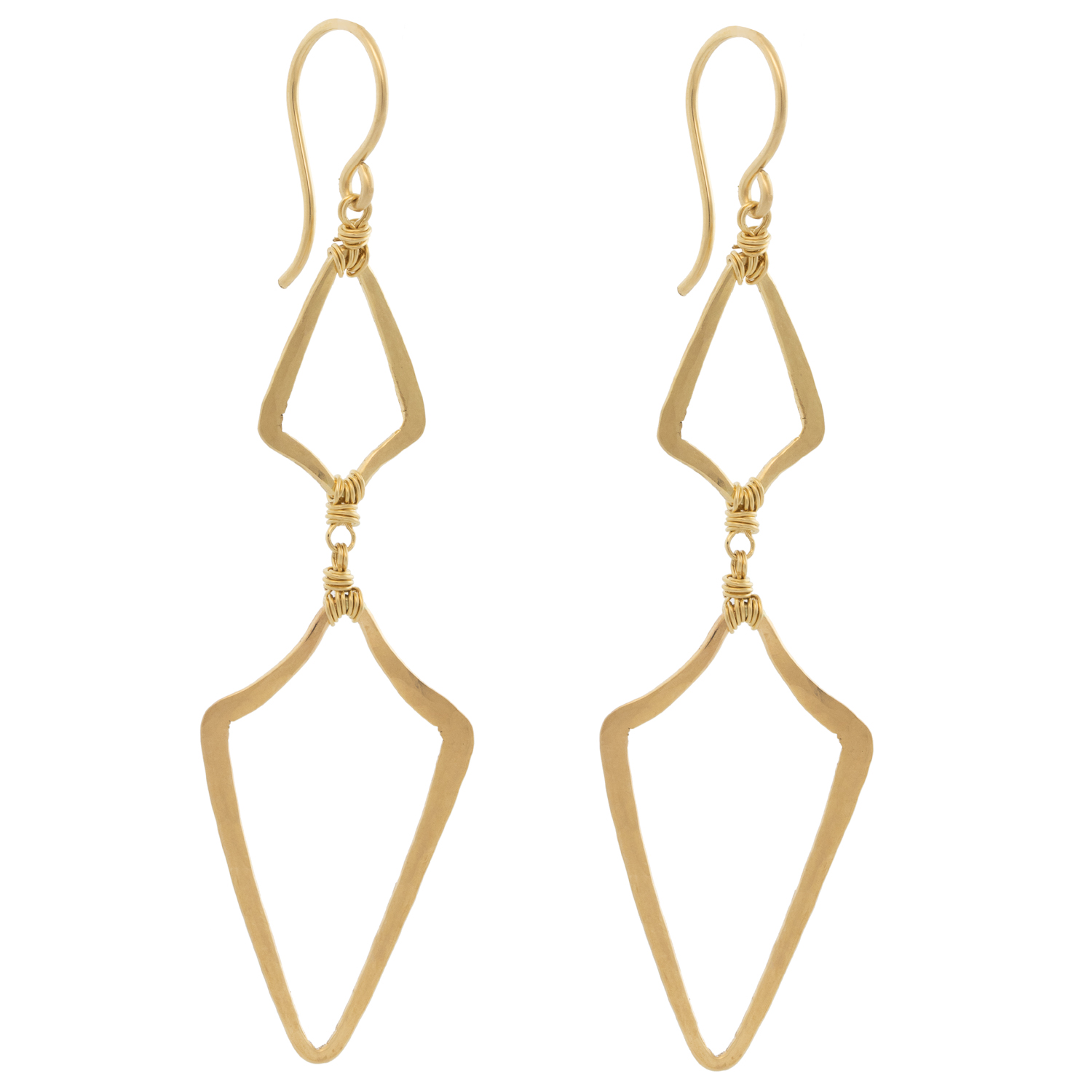 Dynamic shapes are formed in textured gold, open in the centers to create a modern and chic vibe.