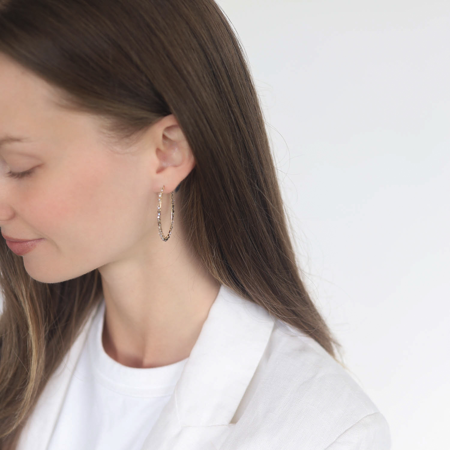Light and dark crystals follow the slope of these oval hoops putting a fun, modern twist on a classic look.
