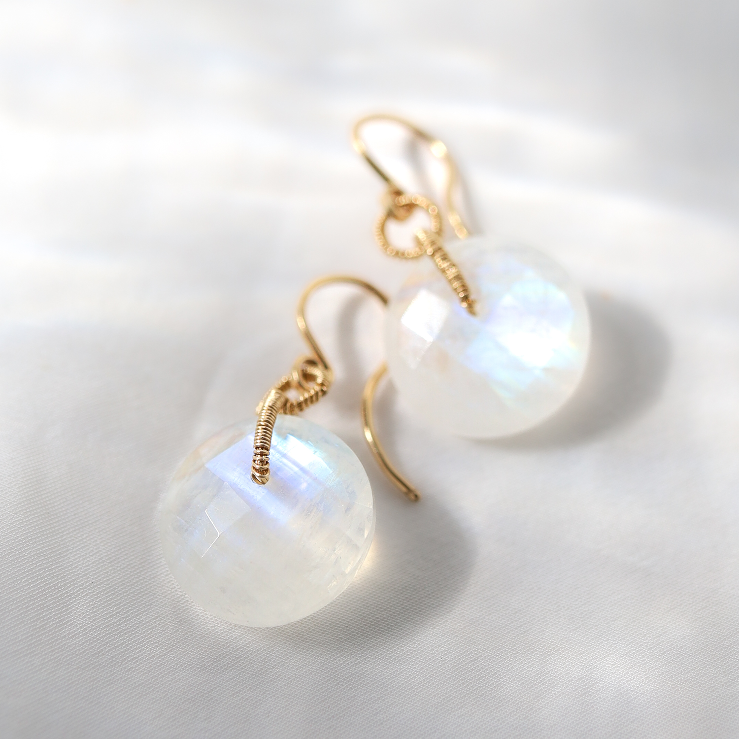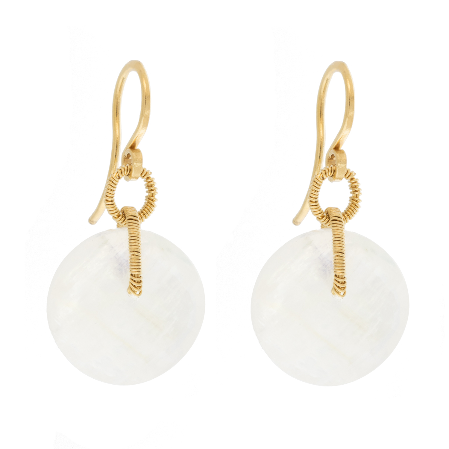 Glowing white moonstone discs dangle from delicate gold loops wrapped in Dana Kellin’s signature wire detailing. Perfect for adding a subtle ethereal touch to any outfit.