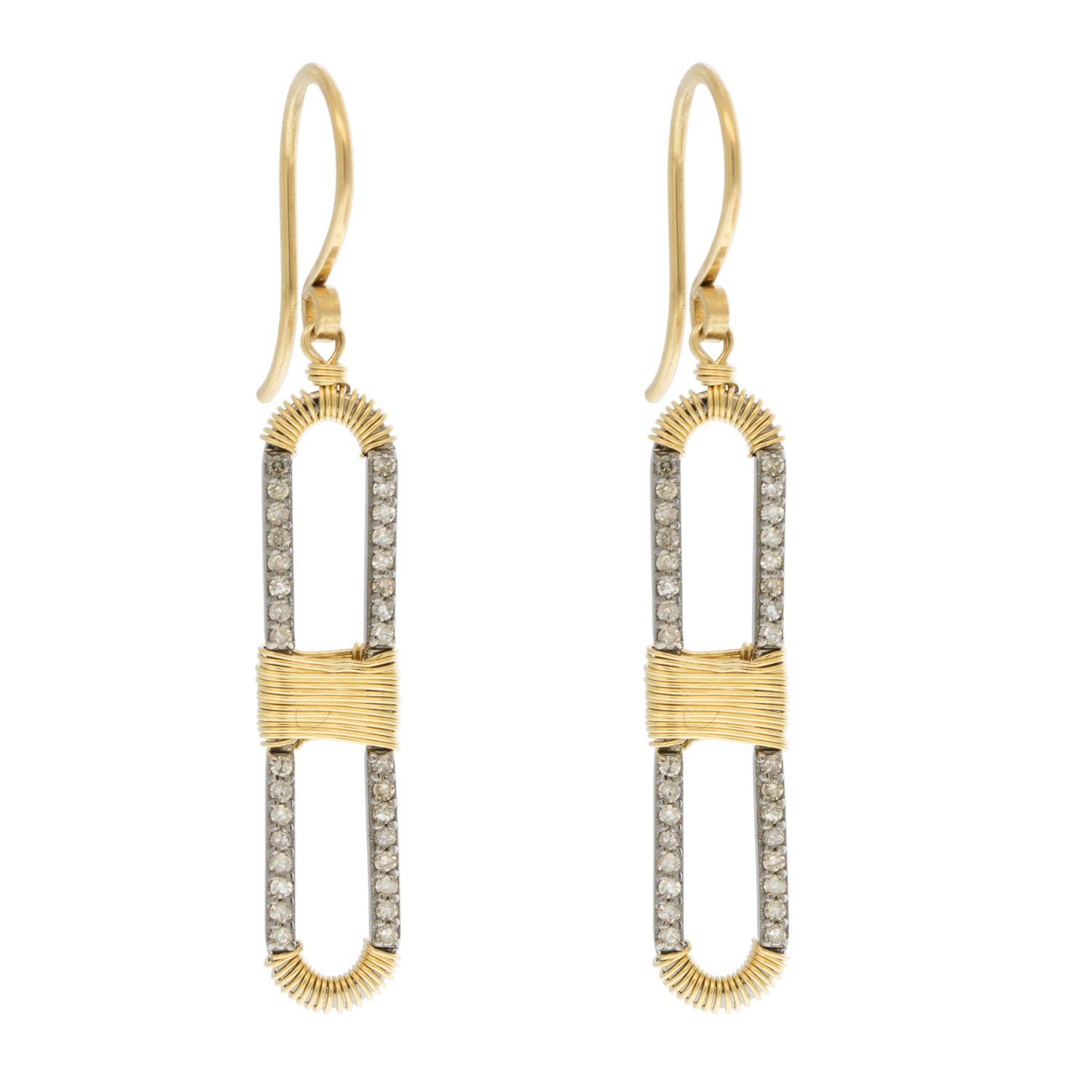 A modern take on the classic paperclip silhouette, these earrings feature diamond-accented links wrapped in Dana Kellin’s signature gold wire. Their ultra versatile mixed-metal design pairs effortlessly with both gold and silver jewelry, and complements everything from casual to elevated outfits.