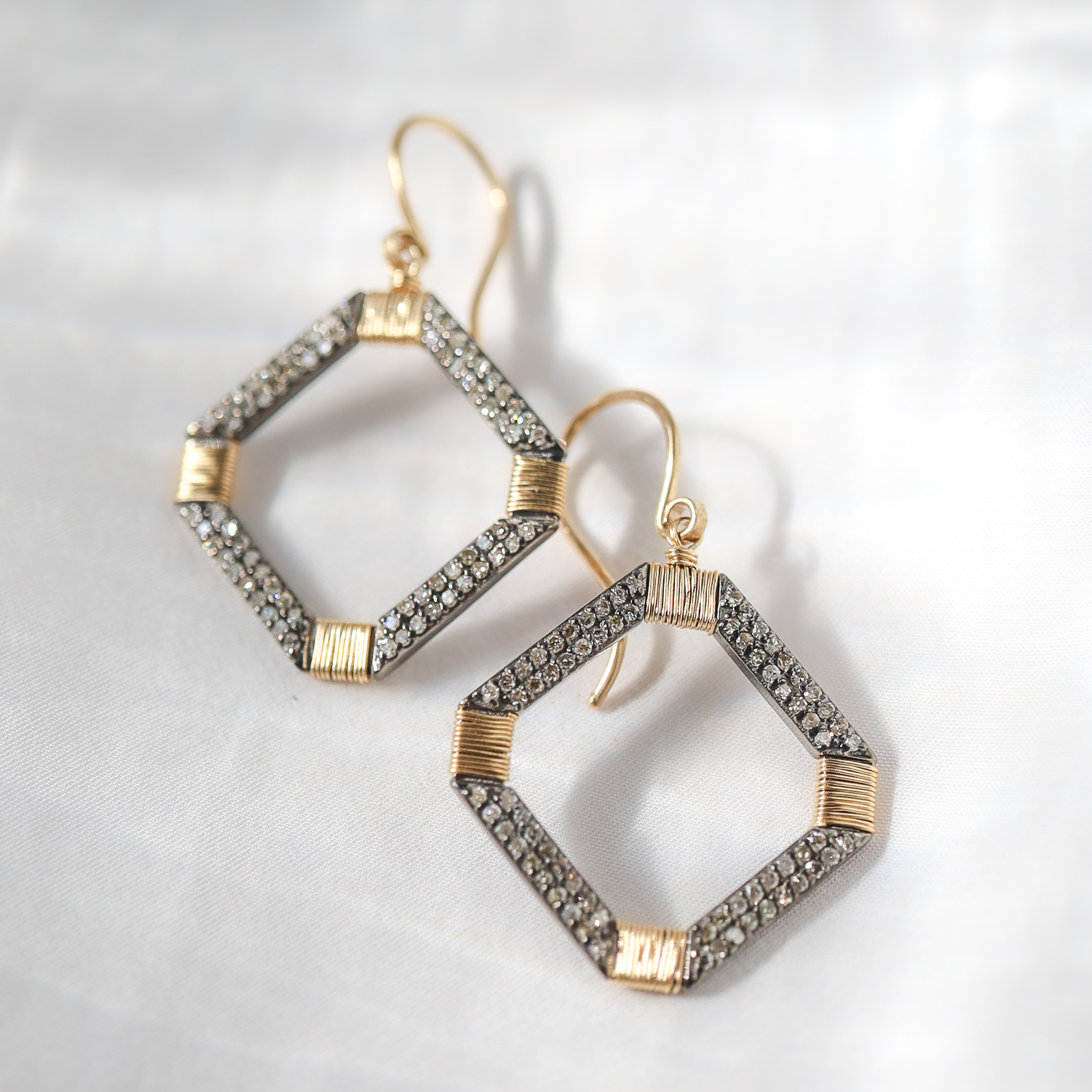 Striking geometric hoops sparkle with pavé diamonds and Dana Kellin’s signature gold wire wrapping. Their ultra versatile mixed-metal design pairs effortlessly with both gold and silver jewelry, and complements everything from casual to elevated outfits.