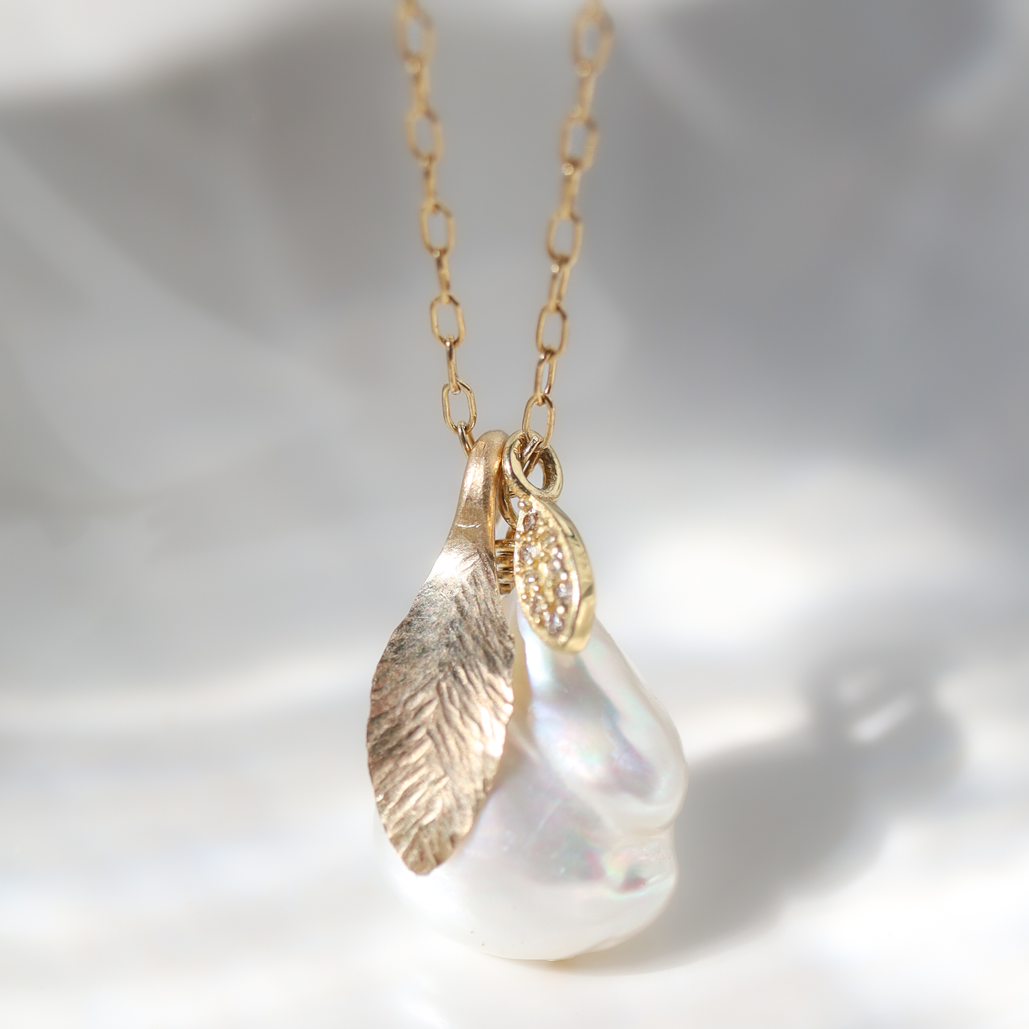 A luminous pearl hangs gracefully from a fine gold chain, accented by a sculpted leaf and a pavé diamond charm. The combination of organic form and subtle sparkle gives this Dana Kellin necklace an effortlessly elegant, nature-inspired allure.