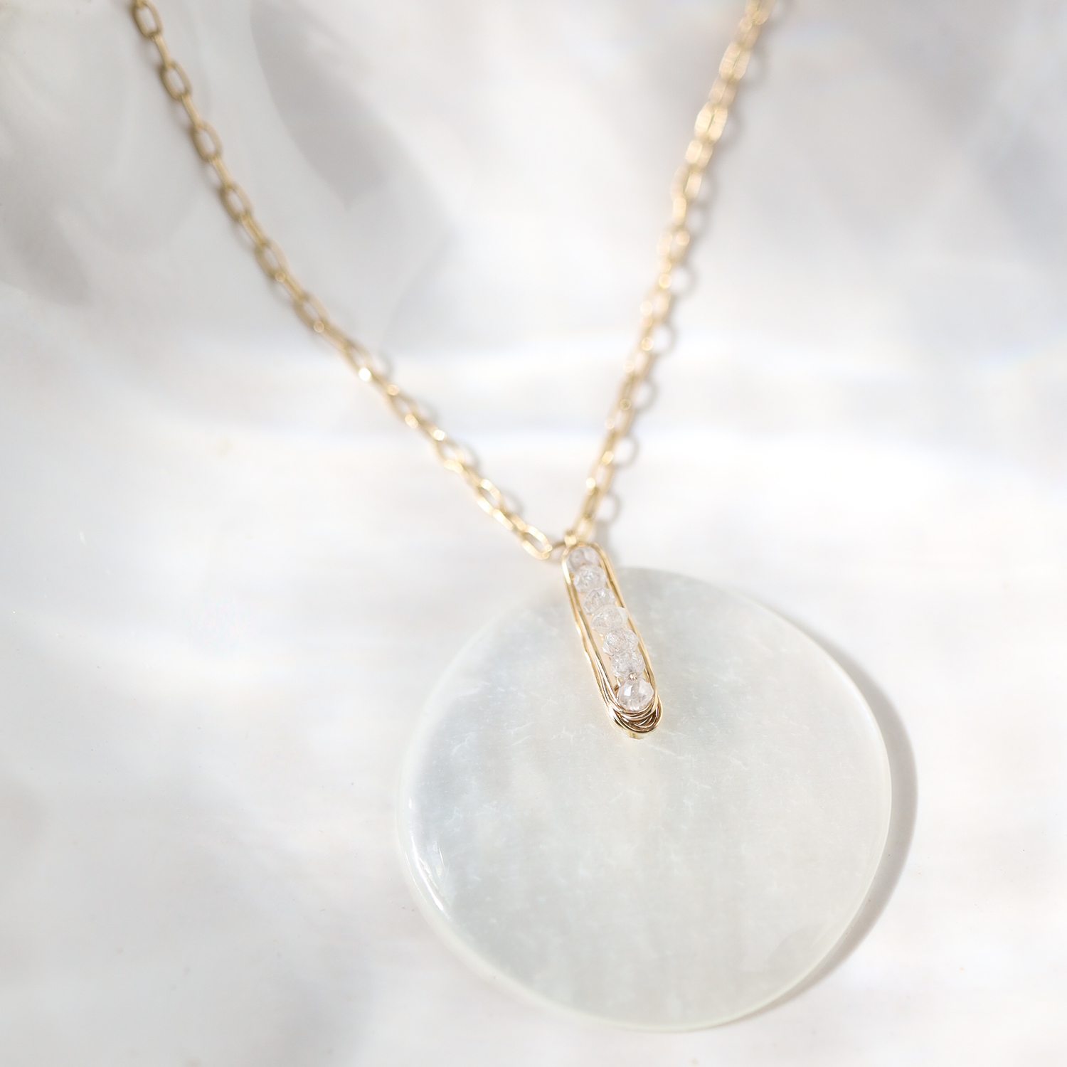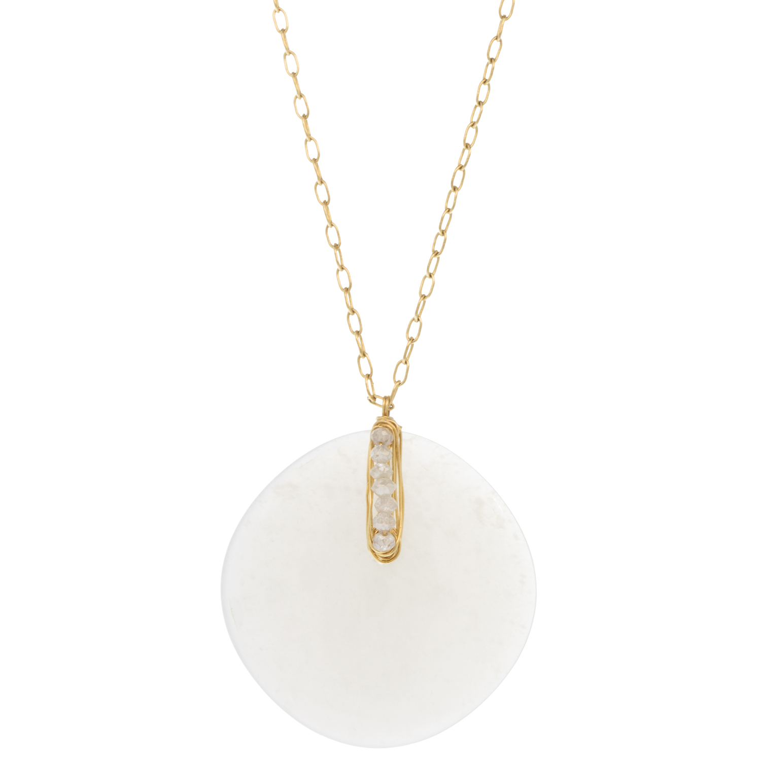 A glowing white moonstone disc hangs gracefully from a fine gold chain, accented with Dana Kellin’s signature wire-wrapped detailing. The design highlights the stone’s natural luminosity, blending modern simplicity with her distinctive handcrafted elegance.